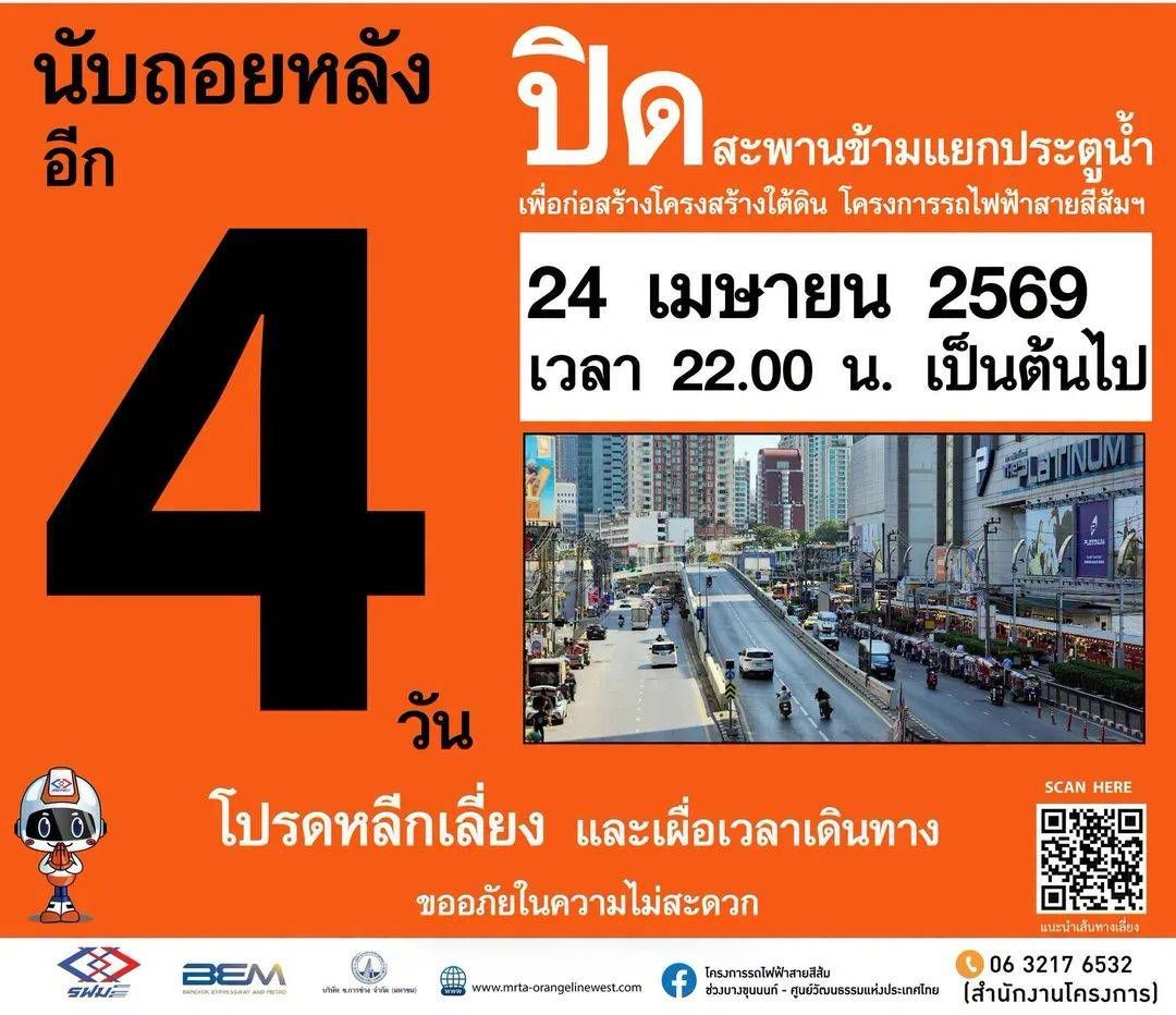 เตรียมพร้อม!! #นับถอยหลัง อีก 4 วัน #เตรียมปิดสะพานข้ามแยกประตูน้ำ 24 เมษายน 2569 เพื่อก่อสร้างโครงสร้างใต้ดิน โครงการรถไฟฟ้าสายสีส้ม ช่วงบางขุนนนท์ - ศูนย์วัฒนธรรมแห่งประเทศไทย