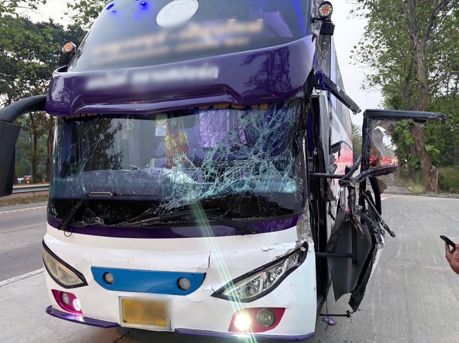 ใกล้กันพบรถทัวร์สีม่วงคาดขาว กาญจนบุรี-เชียงใหม่ ทะเบียนกาญจนบุรี ด้านหน้าฝั่งซ้ายได้รับความเสียหาย โดยมีผู้โดยสารจำนวน 20 คน ล้วนอยู่ในอาการตกใจ แต่ไม่ได้รับบาดเจ็บแต่อย่างใด