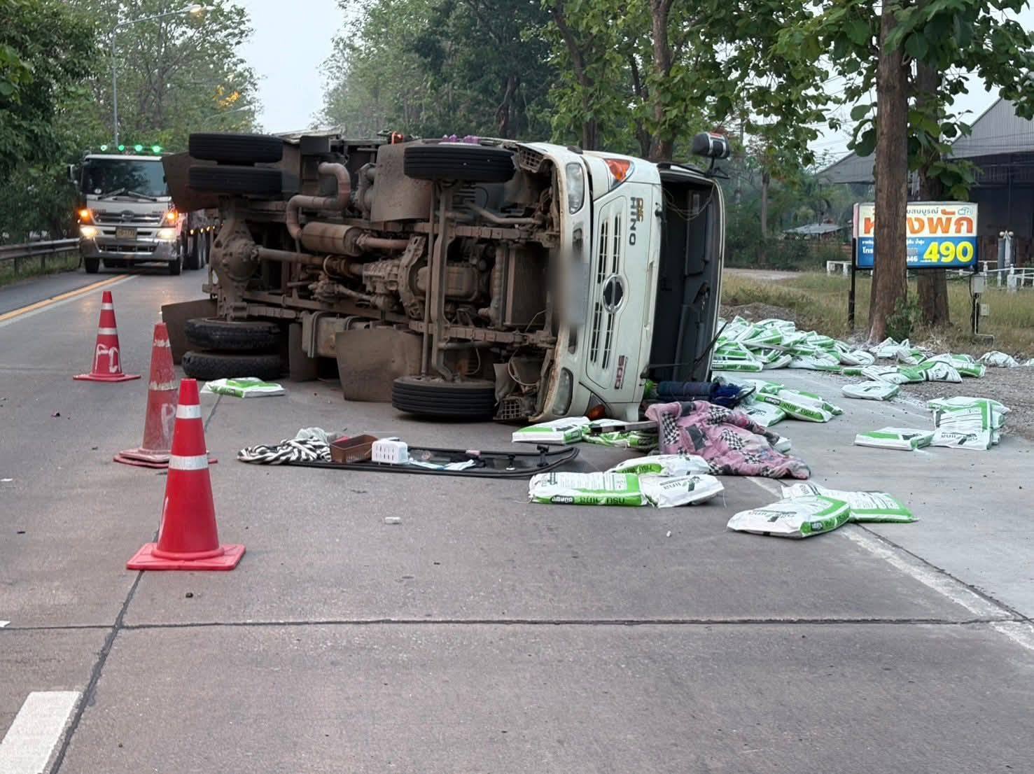 ที่เกิดเหตุพบรถบรรทุก 6 ล้อ สีขาว ยี่ห้อฮีโน่ ทะเบียนเชียงใหม่ พลิกตะแคงเทกระจาดปุ๋ยที่บรรทุกมาตกเกลื่อนถนน คนขับเป็นชายได้รับบาดเจ็บ เจ้าหน้าที่กู้ชีพจึงเร่งปฐมพยาบาลก่อนนำส่งไปรักษาอาการบาดเจ็บที่โรงพยาบาลปรินซ์ ลำพูน
