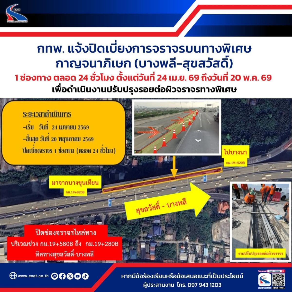 การทางพิเศษแห่งประเทศไทย (กทพ.) กระทรวงคมนาคม ได้ว่าจ้าง กิจการร่วมค้า DW เพื่อดำเนินงานปรับปรุงรอยต่อผิวจราจรทางพิเศษกาญจนาภิเษก (บางพลี-สุขสวัสดิ์) ช่วง กม.19+520 ถึง กม.19+820 ทิศทางบางพลี-สุขสวัสดิ์ และช่วง กม.19+580 ถึง กม.19+280 ทิศทางสุขสวัสดิ์-บางพลี โดยผู้รับจ้างจะเข้าดำเนินงานปรับปรุงรอยต่อผิวจราจรดังกล่าว จึงมีความจำเป็นต้องปิดเบี่ยงการจราจรบนทางพิเศษกาญจนาภิเษก (บางพลี-สุขสวัสดิ์) บริเวณ กม.19+580 B ถึง กม.19+280 B ทิศทางสุขสวัสดิ์-บางพลี 1 ช่องทาง ตลอด 24 ชั่วโมง ตั้งแต่วันที่ 24 เมษายน 2569 ถึงวันที่ 20 พฤษภาคม 2569