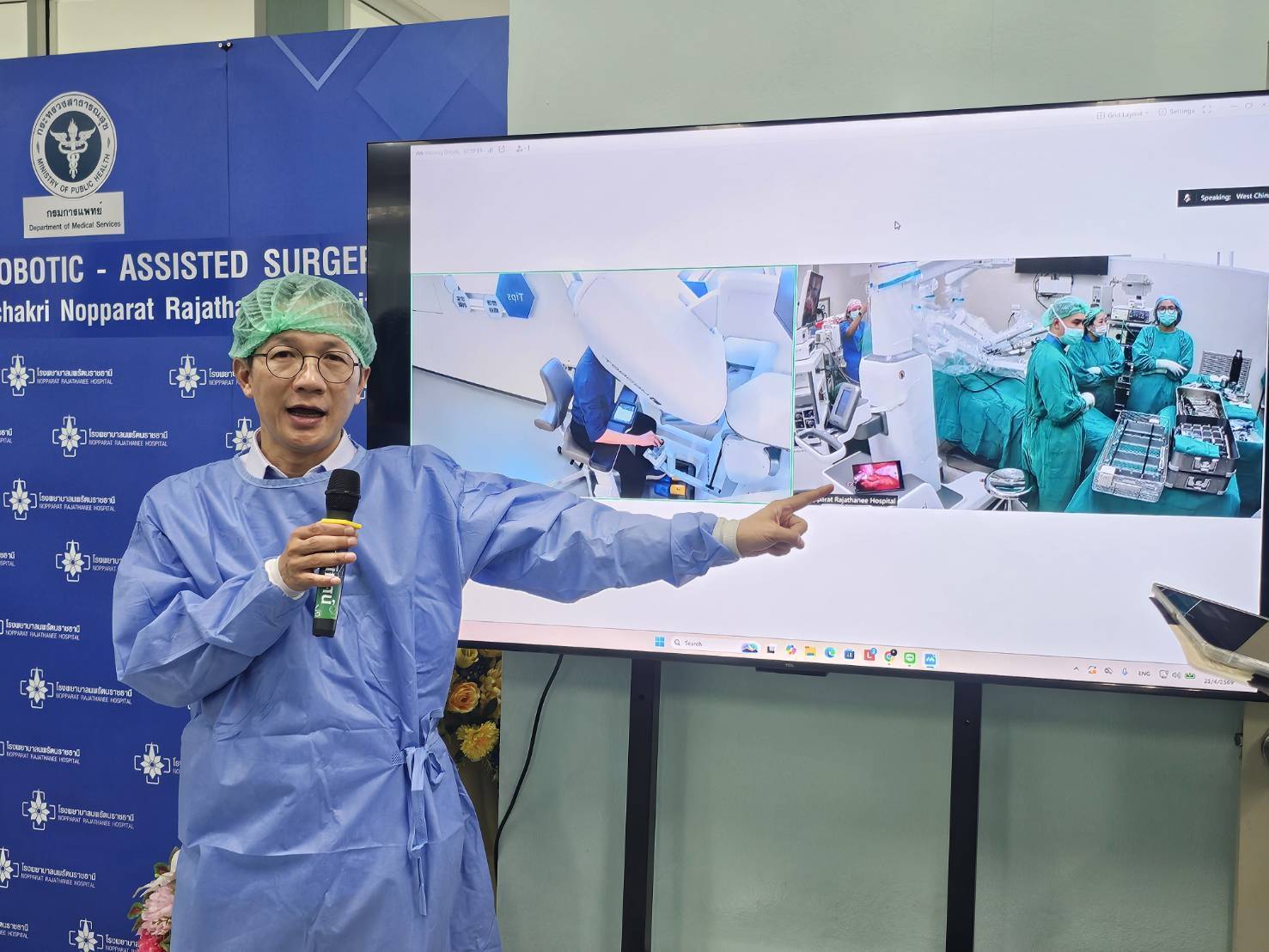 วันที่ 23 เมษายน 2569 สำนักข่าวซินหัวรายงาน ณ โรงพยาบาลนพรัตนราชธานี ในกรุงเทพฯ แขนกลหุ่นยนต์ผ่าตัดล้ำสมัยจากจีนกำลังผ่าตัดนิ่วในถุงน้ำดีให้ผู้ป่วยรายหนึ่ง ซึ่งความพิเศษของการผ่าตัดครั้งนี้คือศัลยแพทย์ปฏิบัติหน้าที่อยู่ไกลออกไปกว่า 2,000 กิโลเมตร โดยแพทย์หญิงภัทราภรณ์ เพชรโพธิ์ศรี ควบคุมหุ่นยนต์ผ่าตัดจากระยะไกลอยู่ที่โรงพยาบาลเวสต์ ไชน่า ในเครือมหาวิทยาลัยซื่อชวน มณฑลเสฉวน ทางตะวันตกเฉียงใต้ของจีน