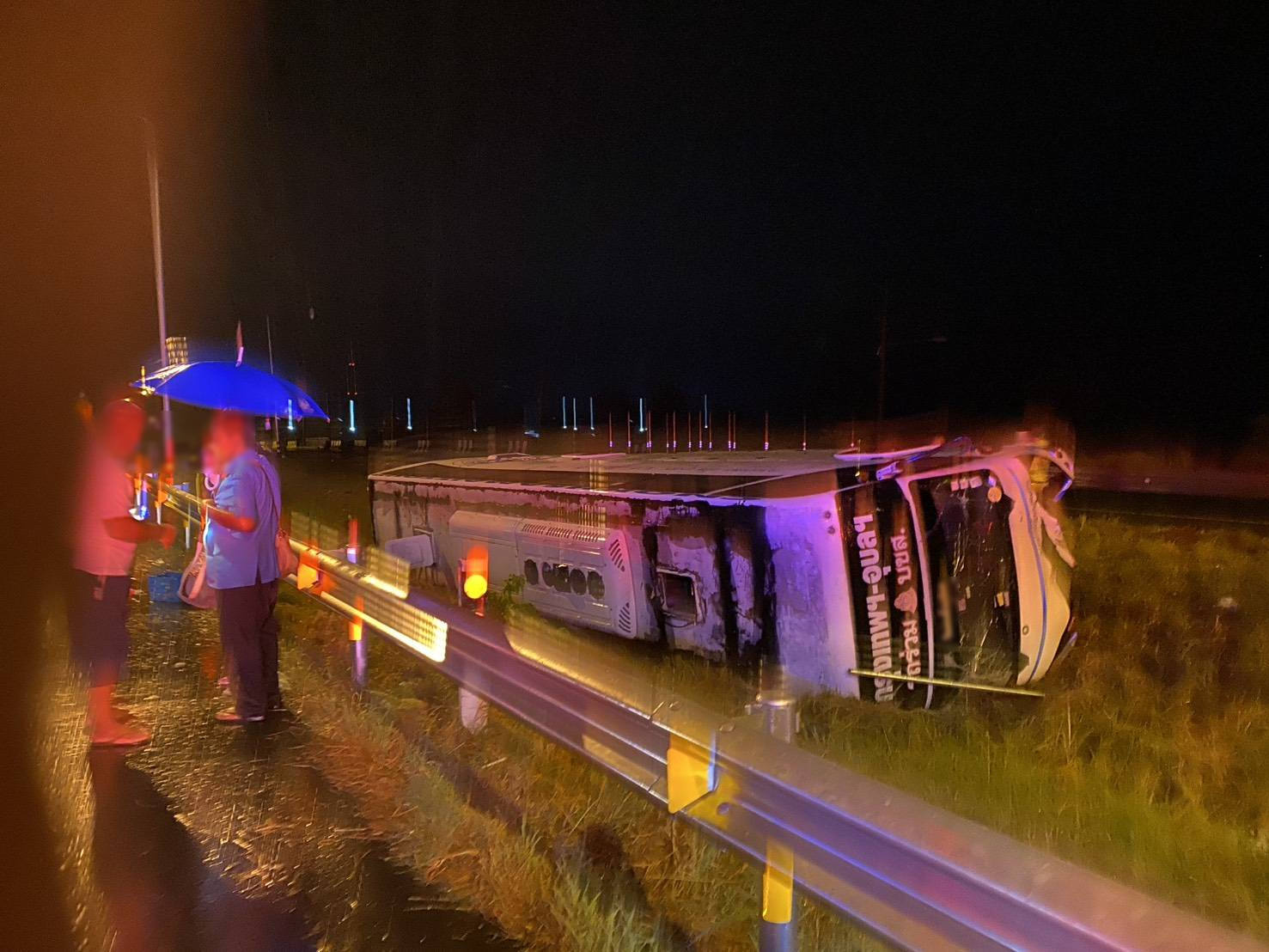 รถทัวร์สาย กทม. - อุบลราชธานี เสียหลักพลิกลงร่องกลาง ถนนทางหลวงหมายเลข 23 มีผู้บาดเจ็บหลายราย จ.อุบลราชธานี
