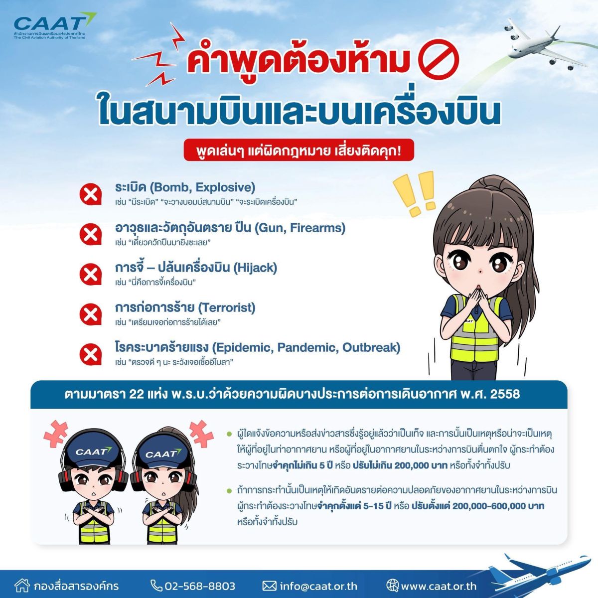 “ขอย้ำว่าความปลอดภัยของผู้โดยสารและการบินเป็นสิ่งสำคัญสูงสุด การกล่าวอ้างหรือกระทำการใดที่สร้างความตื่นตระหนก ไม่ว่าจะด้วยเจตนาหรือหยอกล้อ ล้วนมีความผิดตามกฎหมาย และเจ้าหน้าที่จะดำเนินการอย่างเด็ดขาด” นายภัทรพงศ์ กล่าว