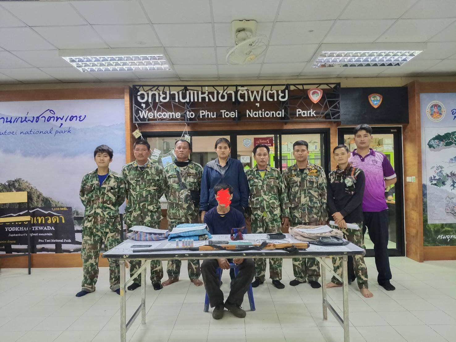 กระทั่งเวลาประมาณ 19.57 น. เจ้าหน้าที่พบชาย 1 คน อายุ 57 ปี เดินออกมาจากป่ามุ่งหน้าไปยังรถจักรยานยนต์ที่จอดอยู่ ชุดปฏิบัติการจึงแสดงตัวเข้าทำการตรวจค้น ผลการตรวจสอบพบอาวุธปืนลูกซองเดี่ยวสภาพพร้อมใช้งาน 1 กระบอก กระสุนในรังเพลิง 1 นัด และกระสุนสำรองอีก 4 นัด
