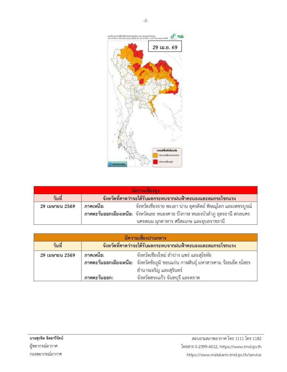 ประกาศกรมอุตุนิยมวิทยา พายุฤดูร้อนบริเวณประเทศไทยตอนบน (มีผลกระทบตั้งแต่วันที่ 29 เมษายน – 1 พฤษภาคม 2569) ฉบับที่1 (41/2569) ในช่วงวันที่ 29 เม.ย. – 1 พ.ค. 69 ประเทศไทยตอนบนจะมีพายุฤดูร้อนเกิดขึ้น โดยมีลักษณะของพายุฝนฟ้าคะนองลมกระโชกแรง ลูกเห็บตก และฝนตกหนักบางแห่ง รวมถึงอาจมีฟ้าผ่าเกิดขึ้นได้บางพื้นที่ โดยจะเริ่มจากภาคเหนือ ภาคตะวันออกเฉียงเหนือ และภาคตะวันออกก่อน ส่วนภาคกลาง รวมทั้งกรุงเทพมหานครและปริมณฑล จะได้รับผลกระทบในระยะถัดไป เนื่องจากบริเวณความกดอากาศสูงหรือมวลอากาศเย็นจากประเทศจีนจะแผ่ลงมาปกคลุมภาคตะวันออกเฉียงเหนือและทะเลจีนใต้ ในขณะที่ประเทศไทยตอนบนมีอากาศร้อนถึงร้อนจัด