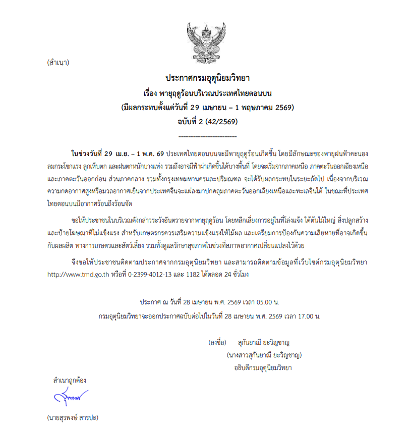 ประกาศกรมอุตุนิยมวิทยา เรื่อง พายุฤดูร้อนบริเวณประเทศไทยตอนบน (มีผลกระทบตั้งแต่วันที่ 29 เมษายน – 1 พฤษภาคม 2569) ฉบับที่ 2