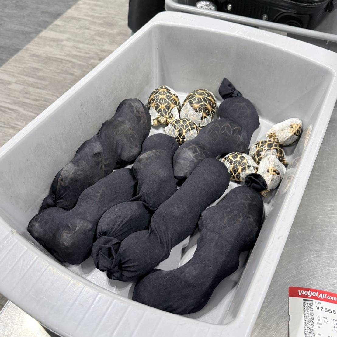 จากการตรวจสอบพบ หญิงสัญชาติไต้หวัน อายุ 19 ปี ผู้โดยสารสายการบินเวียดเจ็ทแอร์ เที่ยวบินที่ VZ568 ปลายทางกรุงไทเป มีท่าทีพิรุธบริเวณลำตัว เมื่อทำการขอตรวจค้นโดยละเอียด เจ้าหน้าที่พบสัตว์ป่าของกลางซุกซ่อนอยู่ตามร่างกาย โดยผู้ต้องหาใช้ "วิธีการรัดสัตว์ด้วยกระดาษกาว" เพื่อจำกัดการเคลื่อนไหว บรรจุใส่ถุงผ้าแล้วแปะติดไว้กับตัวเพื่อหลบเลี่ยงการตรวจจับของเจ้าหน้าที่ จากการตรวจสอบของกลางพบว่าเป็น "เต่าดาวอินเดีย" (Indian Star Tortoise) สัตว์ป่าในบัญชีควบคุม ซึ่งมีมูลค่าสูงในตลาดมืด รวมทั้งสิ้น 30 รายการ แบ่งเป็น เต่าดาวอินเดียที่มีชีวิต 29 ตัว และซากเต่าดาวอินเดีย 1 ซาก