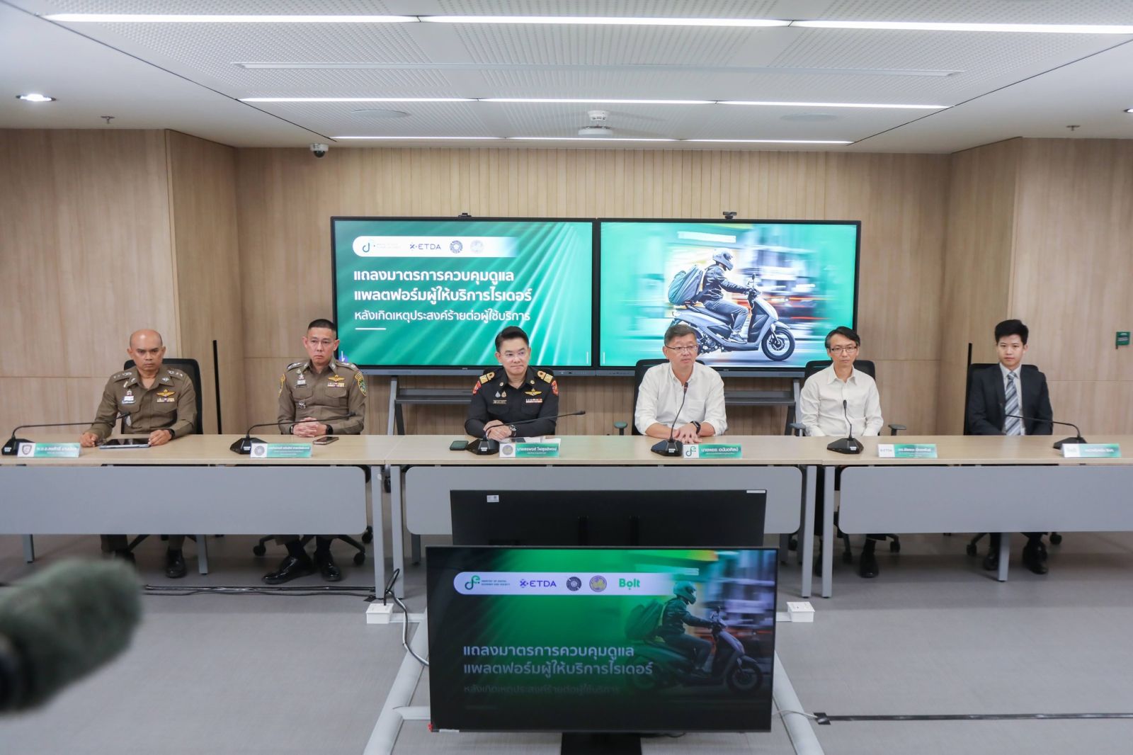 วันที่ 29 เมษายน 2569 นายพชร อนันตศิลป์ ปลัดกระทรวงดิจิทัลเพื่อเศรษฐกิจและสังคม (ดีอี) เป็นประธานการแถลงข่าวมาตรการควบคุมดูแลแพลตฟอร์มผู้ให้บริการไรเดอร์ หลังเกิดเหตุประสงค์ร้ายต่อผู้ใช้บริการ ร่วมด้วย ดร.ชัยชนะ มิตรพันธ์ ผู้อำนวยการสำนักงานพัฒนาธุรกรรมทางอิเล็กทรอนิกส์ (สพธอ.) หรือ ETDA นายสรพงศ์ ไพฑูรย์พงษ์ อธิบดีกรมการขนส่งทางบก (ขบ.) พล.ต.ต. ชนันนัทธ์ สารถวัลย์แพศย์ ผู้บังคับการปราบปรามการกระทำความผิดเกี่ยวกับอาชญากรรมทางเทคโนโลยี (ผบก.ปอท.) และพ.ต.อ.คงศักดิ์ ปานน้อย ผู้กำกับสถานีตำรวจนครบาลหนองแขม (ผกก.สน.หนองแขม) และณัฐดนย์ สุขศิริฐานันท์ ผู้จัดการทั่วไป โบลท์ ประเทศไทย