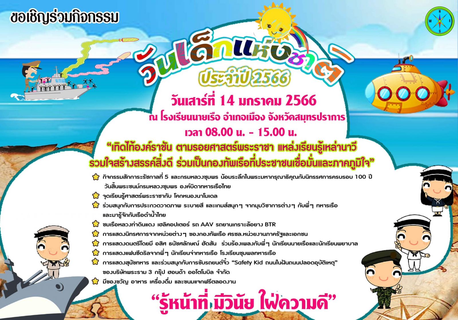 -ทัพเรือภาคที่ 1 จัดกิจกรรมฯ ที่ฐานส่งกำลังบำรุงทหารเรือตราด อำเภอแหลมงอบ จังหวัดตราด มีการเล่นเกม การแสดงต่าง ๆ ของเด็ก ,แจกของขวัญของรางวัลสำหรับเด็ก}การเยี่ยมซมเรือหลวง และอากาศยาน บริเวณท่าเทียบเรือ ฐานส่งกำลังบำรุงทหารเรือตราด