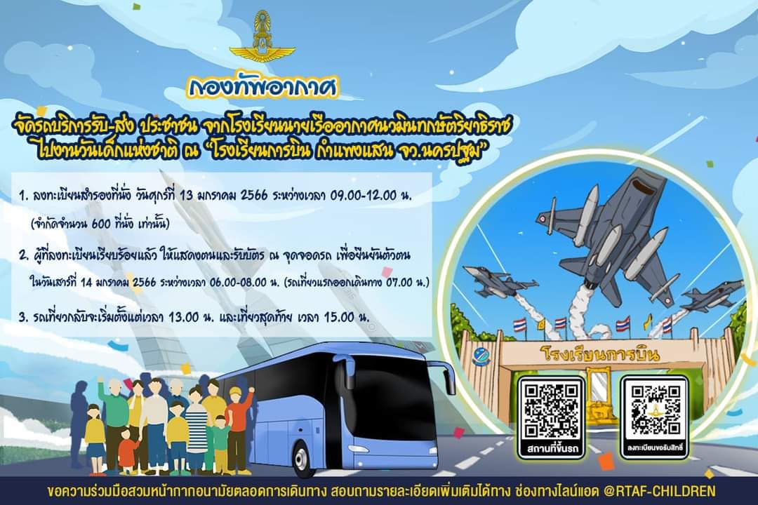 ทั้งนี้ กองทัพอากาศ ได้จัดรถโดยสารปรับอากาศ จากกรมขนส่งทหารอากาศ จำนวน 15 คัน อำนวยความสะดวก รับ-ส่งผู้ร่วมงานจาก โรงเรียนนายเรืออากาศนวมินทกษัตริยาธิราช ไปยัง โรงเรียนการบิน อำเภอกำแพงแสน จังหวัดนครปฐม โดยมีรายละเอียดดังนี้ ลงทะเบียนสำรองที่นั่ง ในวันที่13 ม.ค.2566 ระหว่างเวลา09.00 - 12.00 น. ได้ที่ https://forms.gle/ffweF35y5z8hfLy78 (จำกัดจำนวน 600 ที่นั่งเท่านั้น) โดยผู้ที่ลงทะเบียนเรียบร้อยแล้ว ให้ตรวจสอบรายชื่อ พร้อมแสดงตนเพื่อรับบัตร ณ จุดจอดรถ (หน้าอาคารรณนภากาศ โรงเรียนนายเรือากาศนวมินทกษัตริยาธิราช) เพื่อยืนยันตัวตน ในวันเสาร์ที่ 14 มกราคม 2566 ระหว่างเวลา 06.00 - 08.00 น. (รถเที่ยวแรกออกเดินทาง 07.00 น.) สำหรับเที่ยวกลับ จะเริ่มตั้งแต่เวลา 13.00 และเที่ยวสุดท้ายเวลา 15.00 น.