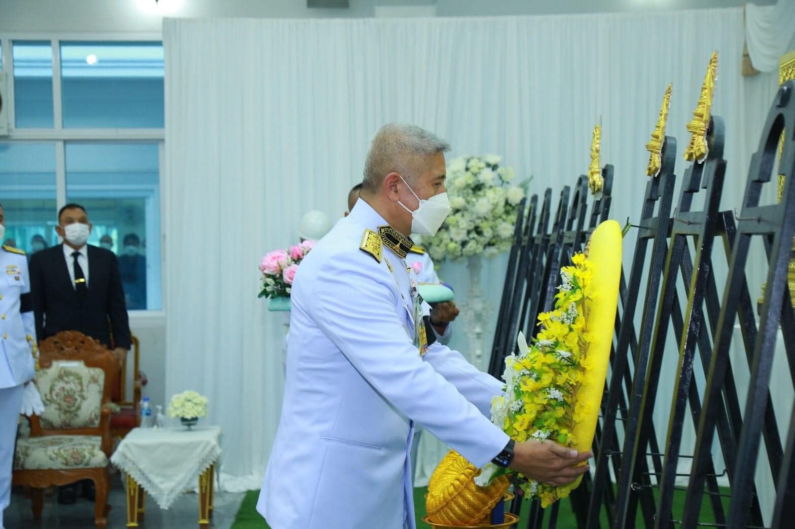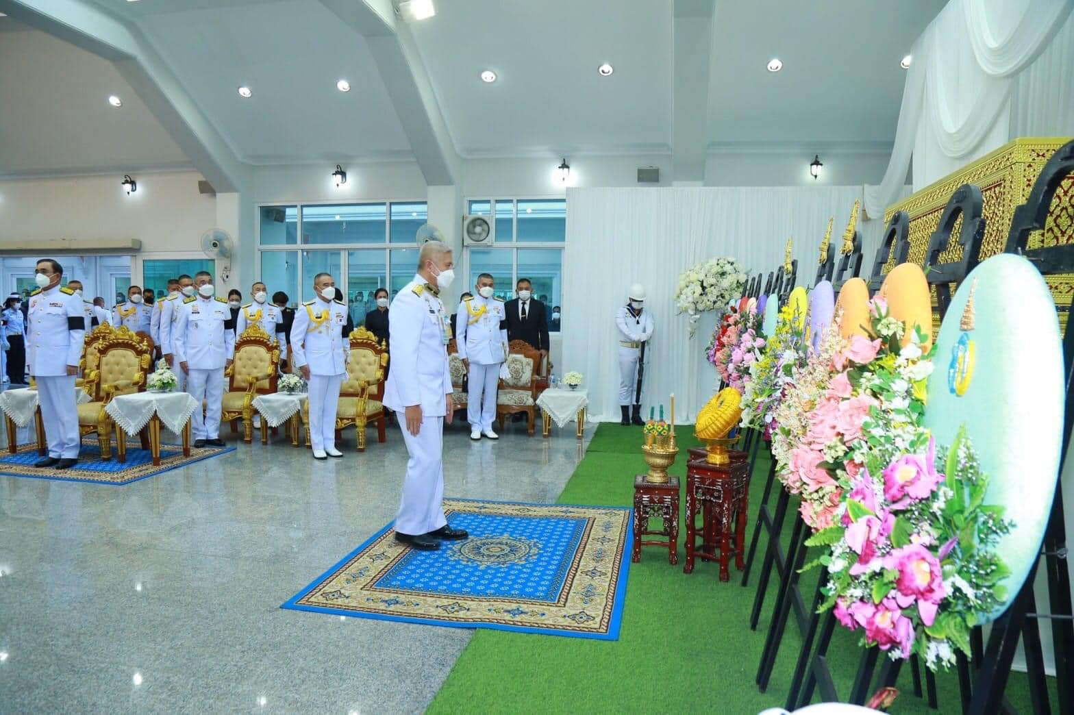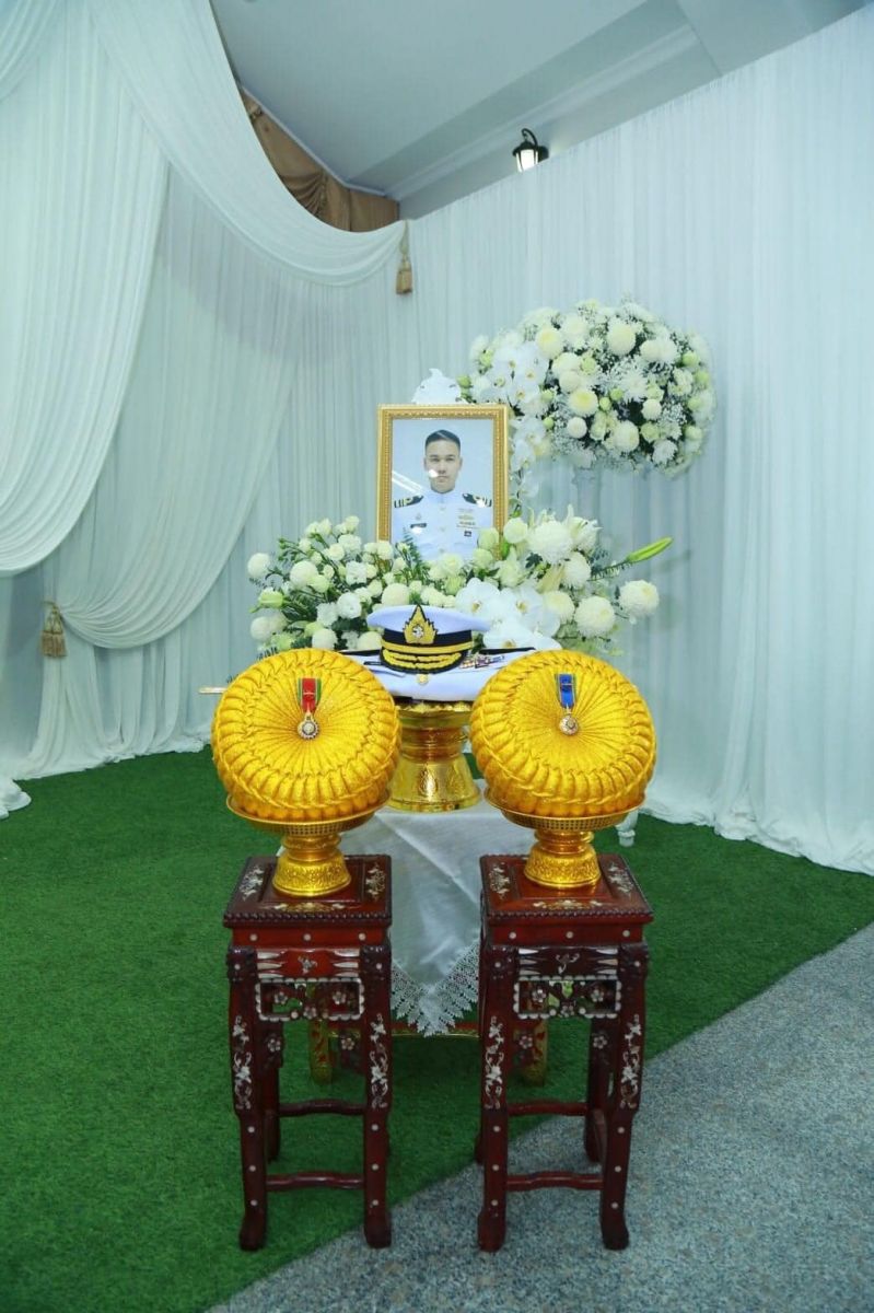 พระบาทสมเด็จพระเจ้าอยู่หัว พระราชทานพวงมาลาวางหน้าหีบศพ ว่าที่ นาวาตรี พลรัตน์ สิโรดม ต้นเรือ เรือหลวงสุโขทัย ที่เสียชีวิตจากเหตุเรือหลวงสุโขทัย อับปางกลางทะเลอ่าวไทย ที่จังหวัดประจวบคีรีขันธ์ ณ วัดศรีเอี่ยม เขตบางนา กรุงเทพมหานคร