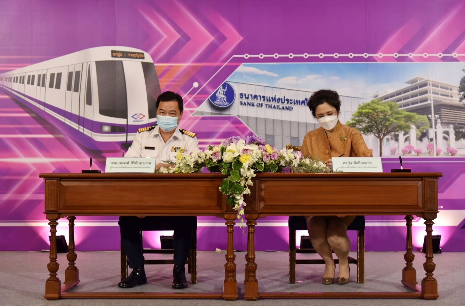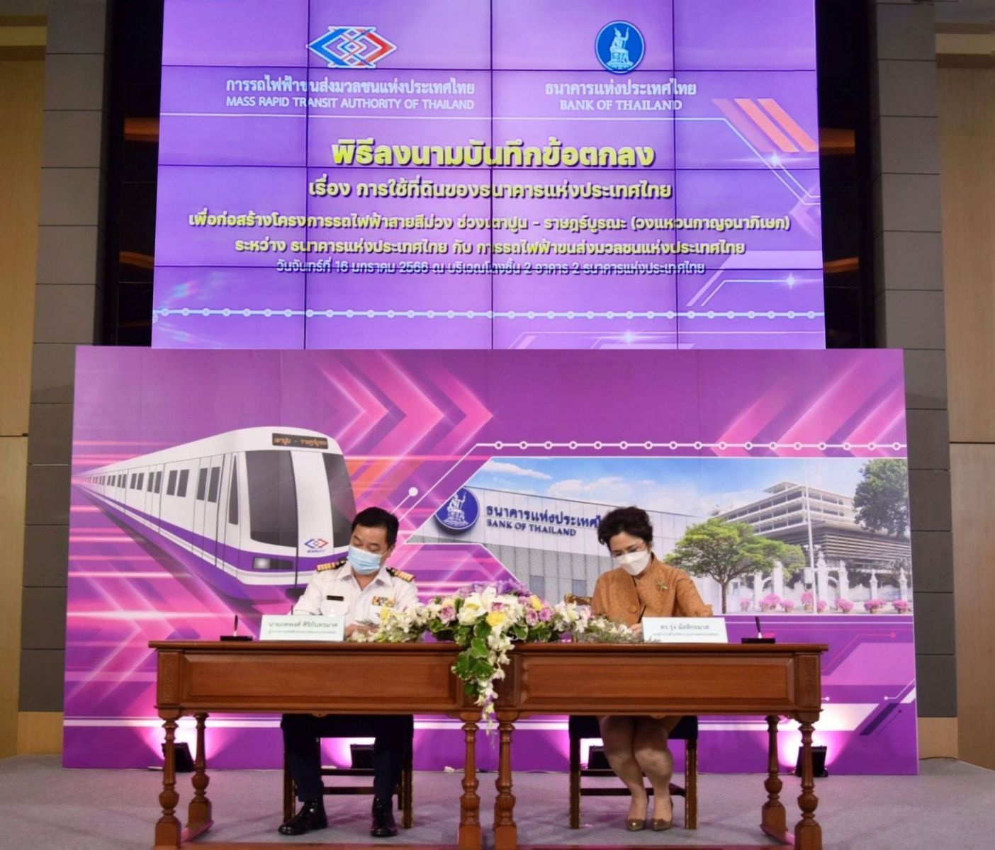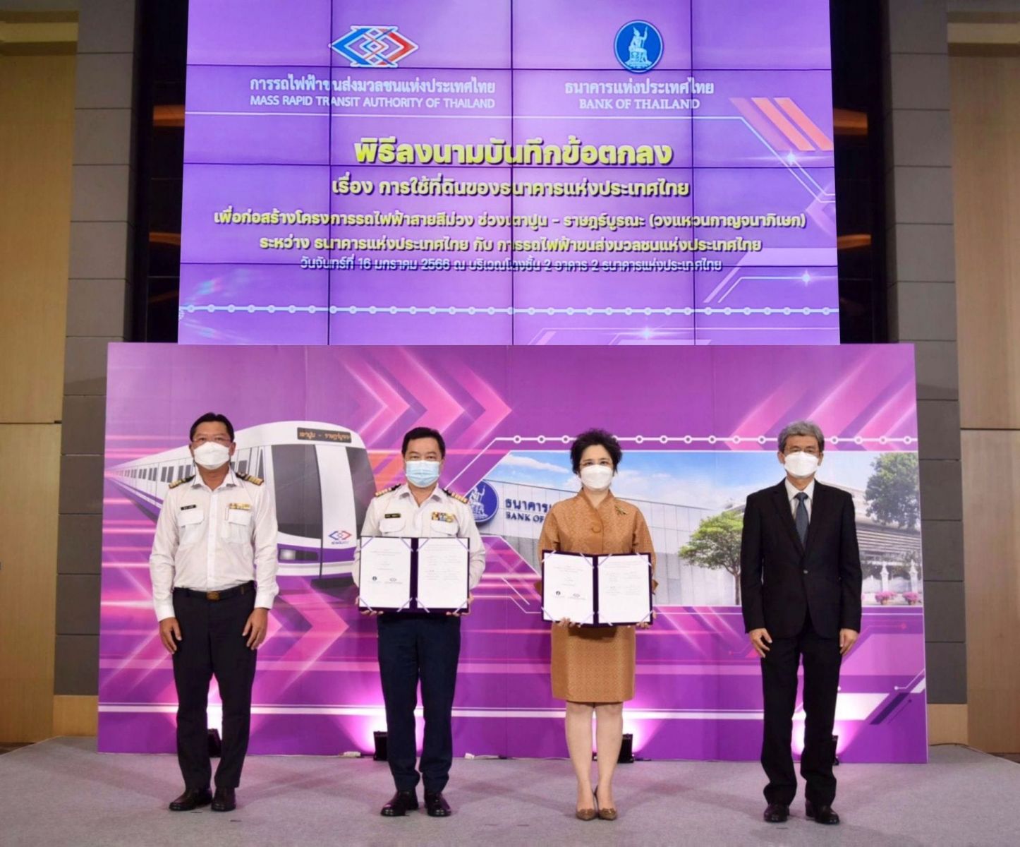 เมื่อวันที่ 16 มกราคม 2566 นายภคพงศ์ ศิริกันทรมาศ ผู้ว่าการการรถไฟฟ้าขนส่งมวลชนแห่งประเทศไทย (รฟม.) และ นางรุ่ง มัลลิกะมาส รองผู้ว่าการ ด้านบริหาร ธนาคารแห่งประเทศไทย (ธปท.) ได้ร่วมลงนามบันทึกข้อตกลง (MOU) ว่าด้วยการใช้ที่ดินของ ธปท. เพื่อก่อสร้างโครงการรถไฟฟ้าสายสีม่วง ช่วงเตาปูน - ราษฎร์บูรณะ (วงแหวนกาญจนาภิเษก) ณ อาคาร 2 ธปท.