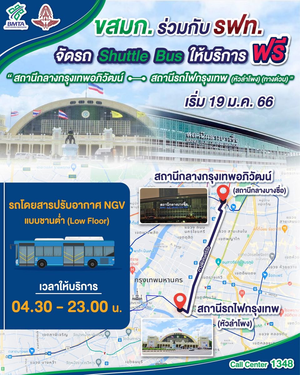 ทั้งนี้ ขสมก. ได้จัดเจ้าหน้าที่สายตรวจพิเศษ และนายตรวจ ประจำจุด ณ สถานีกลางกรุงเทพอภิวัฒน์ และสถานีรถไฟกรุงเทพ (หัวลำโพง) เพื่ออำนวยความสะดวก และประชาสัมพันธ์เส้นทางเดินรถ Shuttle Bus ให้ประชาชนผู้ใช้บริการรับทราบ