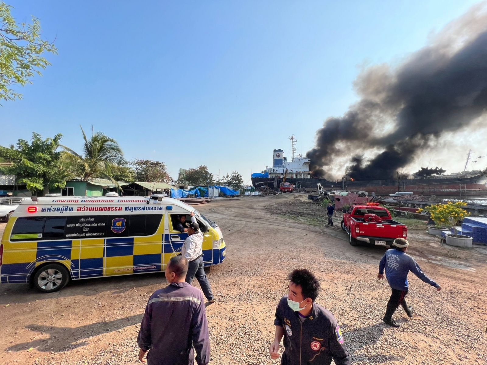 กองอำนวยการป้องกันและบรรเทาสาธารณภัยจังหวัดสมุทรสงคราม โดยนายสมนึก พรหมเขียว ผู้ว่าราชการจังหวัดสมุทรสงคราม นายภราดล รุ่งโรจน์ธีระ หน.สนง.ปภ.สมุทรสงคราม และหน่วยงานที่เกี่ยวข้องลงพื้นที่เกิดเหตุพร้อมจัดตั้งศูนย์ปฏิบัติการเฉพาะกิจให้ความช่วยเหลือผู้ประสบภัยและอำนวยการแก้ไขปัญหา ณ บริเวณสำนักงานรวมมิตรดอกยาร์ด จำกัด ขณะนี้ได้ระดมเจ้าหน้าที่ รถดับเพลิง และเรือดับเพลิงเข้าปฏิบัติการควบคุมเพลิงและดับไฟ รวมถึงประสานรถดับเพลิงชนิดโฟมจากหน่วยงานในพื้นที่และภาคเอกชนสนับสนุนปฏิบัติการการดับเพลิง รวมถึงประสานสำนักงานเจ้าท่าภูมิภาคสาขาสมุทรสงครามนำเรือไปบรรทุกโฟมดับเพลิง