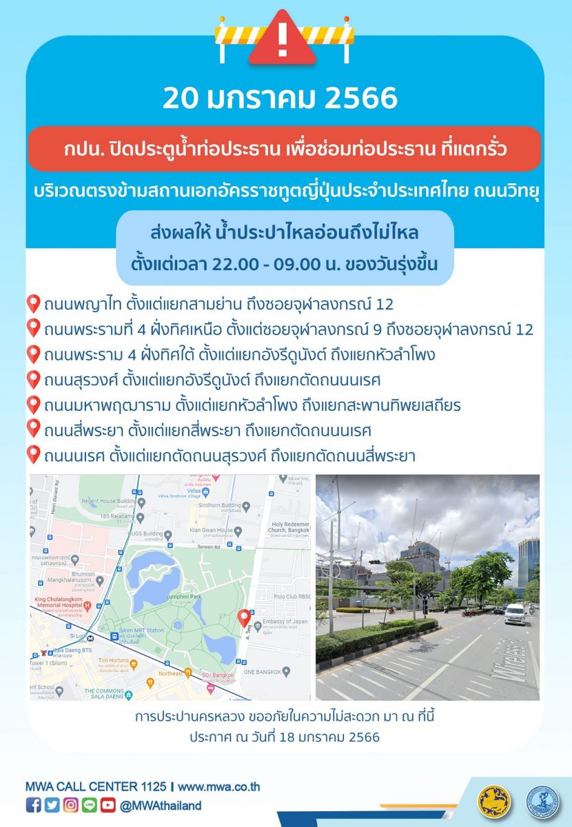 การประปานครหลวง (กปน.) มีความจำเป็นต้องปิดประตูน้ำท่อประธานขนาดเส้นผ่านศูนย์กลาง 800 มิลลิเมตร เพื่อซ่อมท่อประธาน ที่แตกรั่ว บริเวณตรงข้ามสถานเอกอัครราชทูตญี่ปุ่นประจำประเทศไทย ถนนวิทยุ ในคืนวันศุกร์ที่ 20 มกราคม 2566 ตั้งแต่เวลา 22.00 - 09.00 น. ของวันรุ่งขึ้น เพื่อให้ประชาชนได้รับบริการน้ำประปาอย่างเพียงพอและทั่วถึง โดยระหว่างดำเนินการ ส่งผลให้ น้ำประปาไหลอ่อนถึงไม่ไหล ในพื้นที่ดังต่อไปนี้