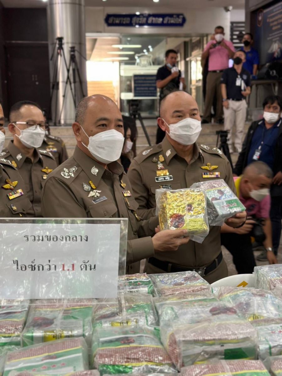 วันนี้ (24 ม.ค.66) พล.ต.อ.ชินภัทร สารสิน รองผู้บัญชาการตำรวจแห่งชาติ แถลงผลการปฏิบัติของกองบัญชาการตำรวจปราบปรามยาเสพติด สามารถจับกุมเครือข่ายค้าไอซ์ 3 คดี รวมยึดของกลางได้กว่า 1,145กิโลกรัม โดยคดีแรก กองบังคับการตำรวจปราบปรามยาเสพติด 4จับกุมนายอาคม อายุ 27 ปี, นางสาวแหม่ม อายุ 32 ปี และนางสาวชญาดา อายุ 35 ปี พร้อมของกลาง ไอซ์ 688กิโลกรัม และรถยนต์ 3 คัน ขณะลำเลียงขนไอซ์จากพื้นที่ภาคกลางไปส่งให้ขบวนการค้ายาเสพติดในประเทศเพื่อนบ้านทางภาคใต้ โดยใช้รถบรรทุกสินค้าทางการเกษตรบังหน้า โดยตำรวจติดตามและเข้าจับกุมได้ ขณะจอดแวะที่ปั๊มน้ำมันในอำเภอเมืองพัทลุง จากนั้นขยายผลไปจับกุมผู้ต้องหาอีก 4 คน พร้อมของกลาง ไอซ์กว่า 43 กิโลกรัม และผงเมทแอมเฟตามีน 660กรัม สำหรับเครือข่ายนี้เป็นกระบวนการค้าไอซ์ข้ามชาติ โดยนำยาเสพติดมาจากภาคอีสาน ส่งต่อกันเป็นทอดๆ ปลายทางประเทศที่สาม โดยมีขบวนการมารอรับยาเสพติดบริเวณชายแดน และมีการซื้อขายยาเสพติดผ่านกันทางแอปพลิเคชันไลน์