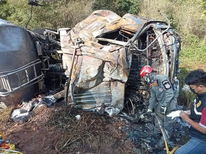 ภายในรถเทรลเลอร์บรรทุกน้ำมัน ที่เกิดเหตุมีผู้เสียชีวิตชาย 1 ราย อายุ 46 ปี