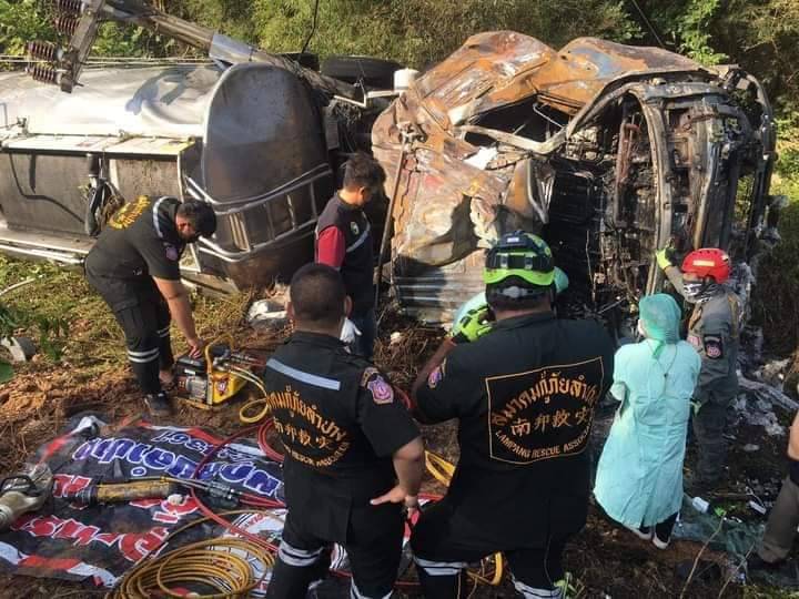 เมื่อเวลา 09.40 น. วันที 16 ธันวาคม 2565 อาสาสมัครสมาคมกู้ภัยลำปาง จุดเถิน พร้อมทีมฯ รับแจ้งเหตุ รถเทรลเลอร์บรรทุกน้ำมันเสียหลัก พุ่งลงข้างทางรถพลิกคว่ำมีไฟลุกไหม้ บริเวณเขตติดต่อเถิน-สบปราบ กม.ที่ 642 จ.ลำปาง