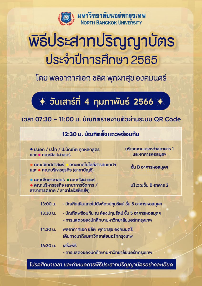 พรุ่งนี้วันเสาร์ที่ 4 กุมภาพันธ์ 2566 มหาวิทยาลัยนอร์ทกรุงเทพ จัดพิธีประสาทปริญญาบัตร แก่บัณฑิตประจำปีการศึกษา 2565 ณ มหาวิทยาลัยนอร์ทกรุงเทพ วิทยาเขตรังสิต อาจทำให้การจราจรบนถนนรังสิต-นครนายก ช่วงขาเข้าและขาออก บริเวณคลอง1 - คลอง5 มีความหนาแน่นเป็นพิเศษ ผู้สัญจรในเส้นทางดังกล่าวโปรดวางแผนการเดินทาง หรือเลี่ยงใช้เส้นทางอื่น เพื่อความสะดวกในการเดินทาง