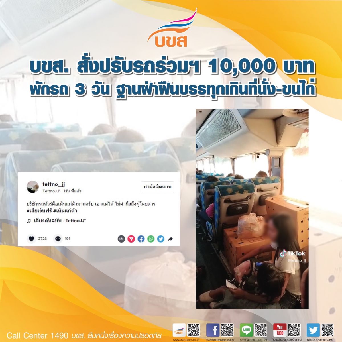 บขส.สั่งปรับรถร่วมฯ 10,000 บาท พักรถ 3 วัน ฐานทำผิด 2 ข้อหา บรรทุกเกินที่นั่ง-ขนสัตว์ต้องห้าม
