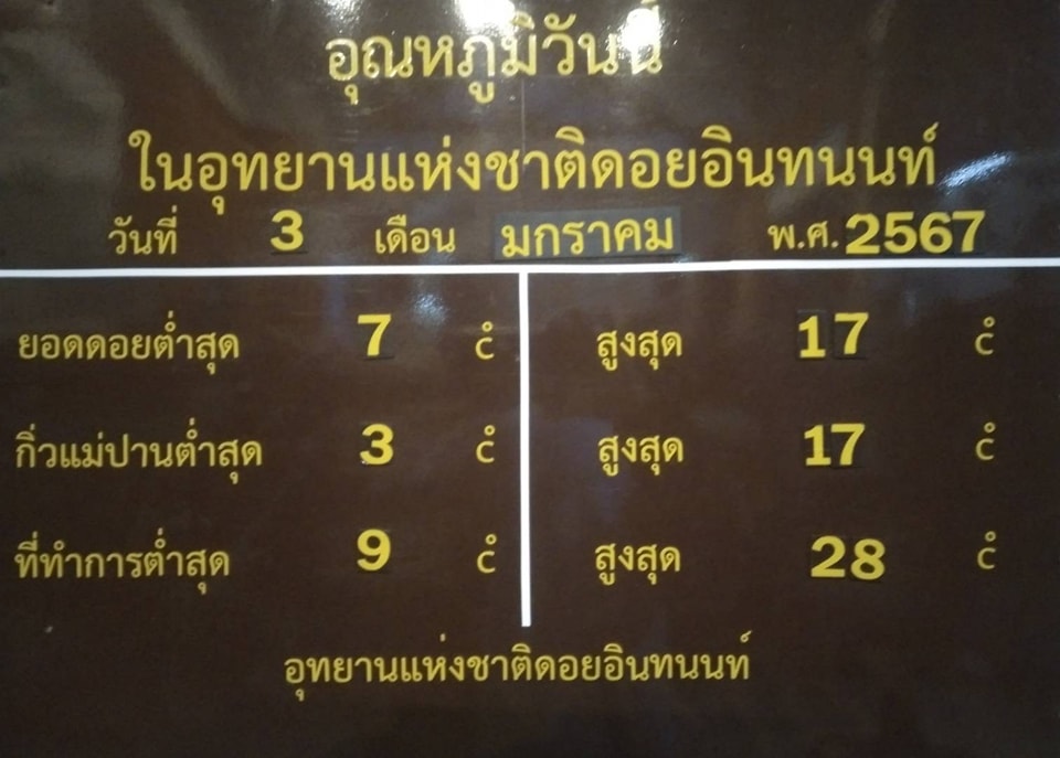 3 ม.ค. 2567 | รายงานสภาพอากาศบนดอยอินทนนท์ อ.จอมทอง จ.เชียงใหม่ โดยเช้านี้ ยอดดอยอินทนนท์ อุณหภูมิต่ำสุด 7 องศา , ส่วนกิ่วแม่ปาน อุณหภูมิต่ำสุด 3 องศา และที่ทำการอุทยานแห่งชาติดอยอินทนนท์ (บ้านขุนกลาง กม.31) อุณหภูมิต่ำสุด 9 องศา อากาศบนยอดดอยอยู่ในเกณฑ์หนาวจัด ส่งผลให้เกิดปรากฏการณ์น้ำค้างแข็งขึ้นในอุทยานแห่งชาติดอยอินทนนท์ เป็นครั้งที่ 11 และนับเป็นครั้งที่ 12 ที่เกิดขึ้นในพื้นที่ของอำเภอจอมทอง จังหวัดเชียงใหม่