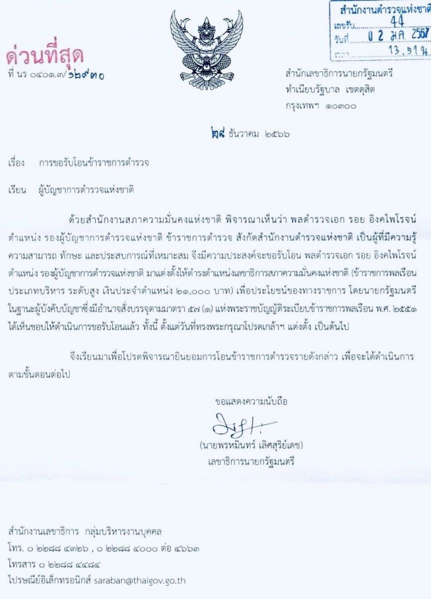 เมื่อวันที่ 3 ม.ค. ที่สำนักงานตำรวจแห่งชาติ (ตร.) มีรายงานว่า นายพรหมินทร์ เลิศสุริย์เดช เลขาธิการนายกรัฐมนตรี สำนักงานเลขาธิการ กลุ่มบริหารงานบุคคล มีหนังสือด่วนที่สุด ที่ นร.0401.3/12930 ลงวันที่ 28 ธ.ค. เรียน ผู้บัญชาการตำรวจแห่งชาติ เรื่อง การขอรับโอนข้าราชการตำรวจ ใจความว่า ด้วยสำนักงานสภาความมั่นคงแห่งชาติ พิจารณาเห็นว่า พล.ต.อ.รอย อิงคไพโรจน์ ตำแหน่ง รองผู้บัญชาการตำรวจแห่งชาติ ข้าราชการตำรวจ สังกัดสำนักงานตำรวจแห่งชาติ เป็นผู้ที่มีความรู้ความสามารถ ทักษะ และประสบการณ์ที่เหมาะสม จึงมีความประสงค์จะขอรับโอน พล.ต.อ.รอย อิงคไพโรจน์ ตำแหน่ง รองผู้บัญชาการตำรวจแห่งชาติ มาแต่งตั้งให้ดำรงตำแหน่งเลขาธิการสภาความมั่นคงแห่งชาติ (ข้าราชการพลเรือนประเภทบริหาร ระดับสูง เงินประจำตำแหน่ง 21,000 บาท) เพื่อประโยชน์ของทางราชการ โดยนายกรัฐมนตรี ในฐานะผู้บังคับบัญชาซึ่งมีอำนาจสั่งบรรจุตามมาตรา 57(1) แห่งพระราชบัญญัติระเบียบข้าราชการพลเรือน พ.ศ.2551 ได้เห็นชอบให้ดำเนินการขอรับโอนแล้ว ทั้งนี้ ตั้งแต่วันที่ทรงพระกรุณาโปรดเกล้าฯ แต่งตั้ง เป็นต้นไป