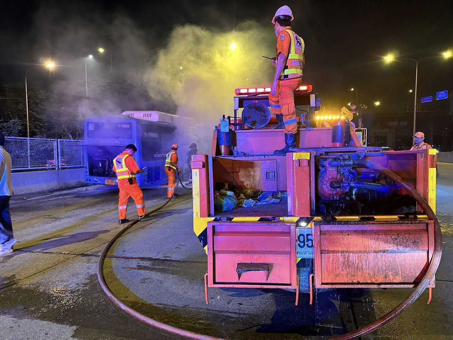 ที่เกิดเหตุ พบรถประจำทางปรับอากาศ สีฟ้า ป้ายทะเบียน กทม. พบเพลิงลุกไหม้ที่ห้องเครื่องยนต์ เจ้าหน้าที่ดับเพลิงกู้ภัยทางด่วน และรถบรรทุกน้ำสำนักงานเขตยานนาวา ใช้น้ำฉีดดับเพลิงสงบ ขณะเกิดเหตุไม่พบผู้บาดเจ็บหรือเสียชีวิต สาเหตุอยู่ระหว่างการสอบสวนของเจ้าหน้าที่ตำรวจพื้นที่ สน.ทางด่วน1