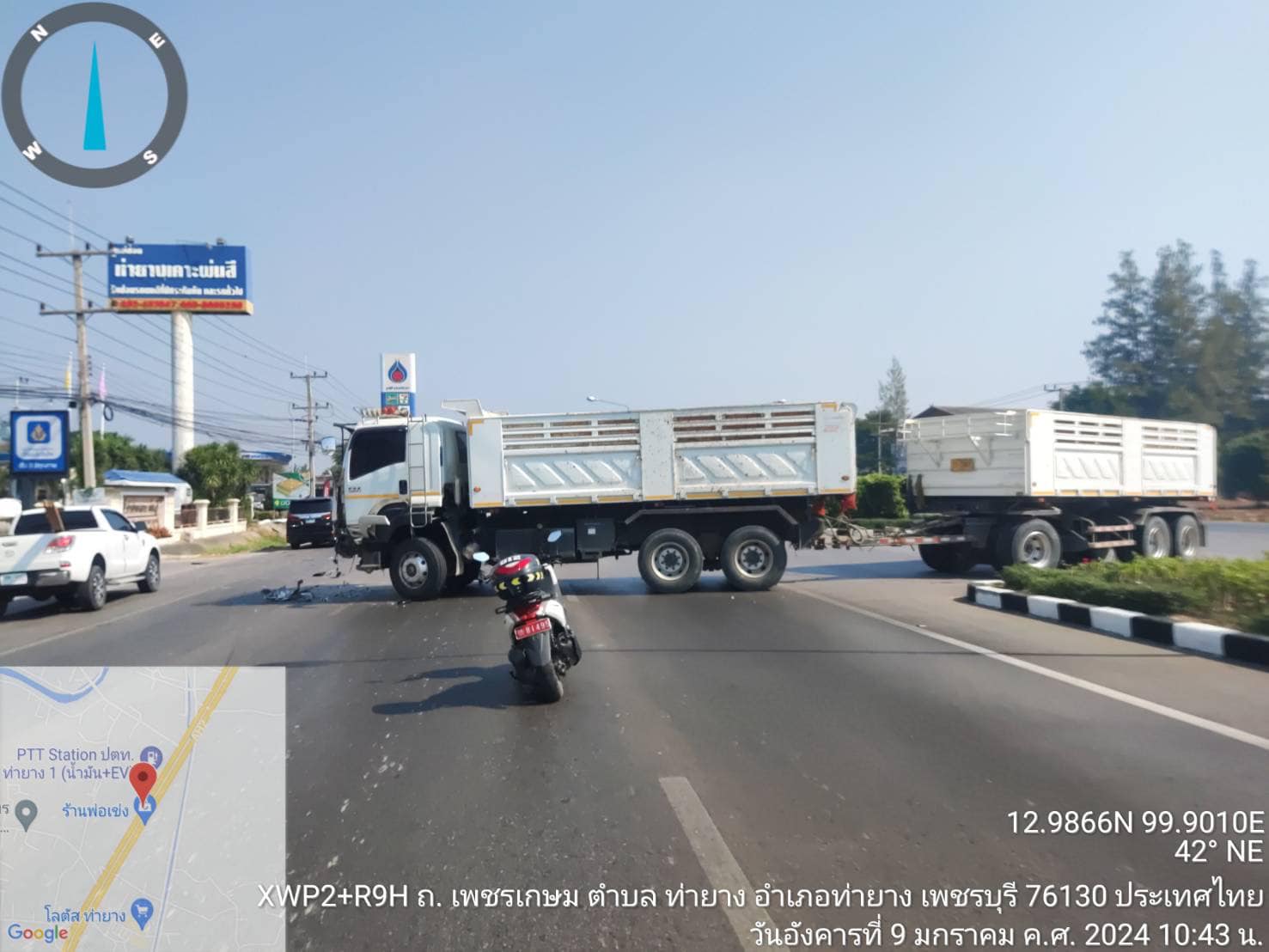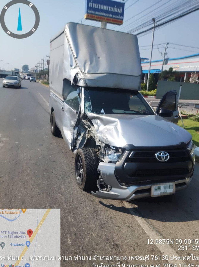 9 ม.ค.2567 เวลา 10.36 น. ศูนย์รับแจ้งเหตุฉุกเฉิน ๑๙๑ เพชรบุรี รายงานอุบัติเหตุ รถกระบะ ชนกับรถพ่วง ถนนเพชรเกษม ขาเข้า หน้าเชียงกงท่ายาง จร.สภ.ท่ายาง เข้าตรวจสอบและช่วยเหลือ ไม่มีคนบาดเจ็บ คู่กรณีไกล่เกลี่ยตกลงกันไม่ได้ ตอนนี้ยังติดชะลอตัว