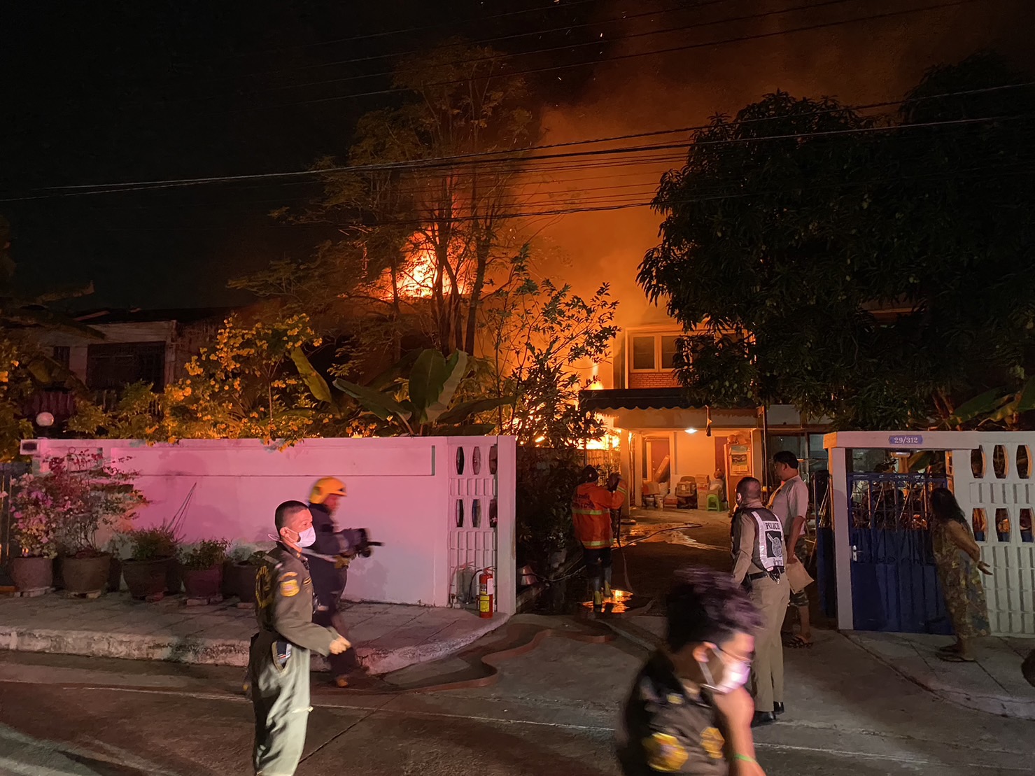 โดยที่เกิดเหตุ ลักษณะเป็นบ้านเดี่ยว 2 ชั้น เพลิงกำลังลุกไหม้รุนแรง เจ้าหน้าที่พร้อมรถดับเพลิงกำลังดำเนินการใช้หัวฉีดน้ำ เบื้องต้นพบผู้บาดเจ็บเป็นหญิง 1 รายอายุประมาณ 70 ปี มีบาดแผลถูกไฟลวก เจ้าหน้าที่ช่วยเหลือและปฐมพยาบาล เวลา 00.05 น. ม.ร่วมกตัญญู คืบหน้าว่า รถน้ำของเทศบาลนครปากเกร็ด ดำเนินการใช้น้ำเป็นผล ล่าสุดเพลิงสงบ เบื้องต้นเสียหายทั้งหลัง พื้นที่ สภ.ปากเกร็ด