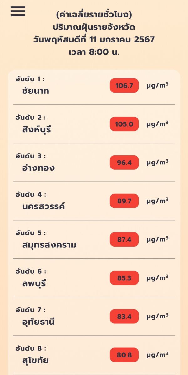 และ พบอีก 33 จังหวัด ที่มีค่าเกินเกณฑ์มาตรฐานในระดับที่เริ่มมีผลกระทบต่อสุขภาพสีส้ม โดย 3 อันดับแรกสีส้ม ได้แก่ สุพรรณบุรี 71.1 ไมโครกรัม ,กาญจนบุรี 68.7ไมโครกรัม และ พิษณุโลก 68.4 ไมโครกรัม