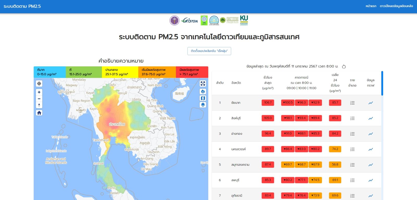 วันที่ 11 มกราคม 2567 GISTDA รายงานสถานการณ์ฝุ่น PM 2.5 เช้าวันนี้เมื่อเวลา 8.00 น. พบ 10 จังหวัด ของประเทศมีค่าฝุ่นเกินเกณฑ์มาตรฐานในระดับที่มีผลกระทบต่อสุขภาพสีแดง