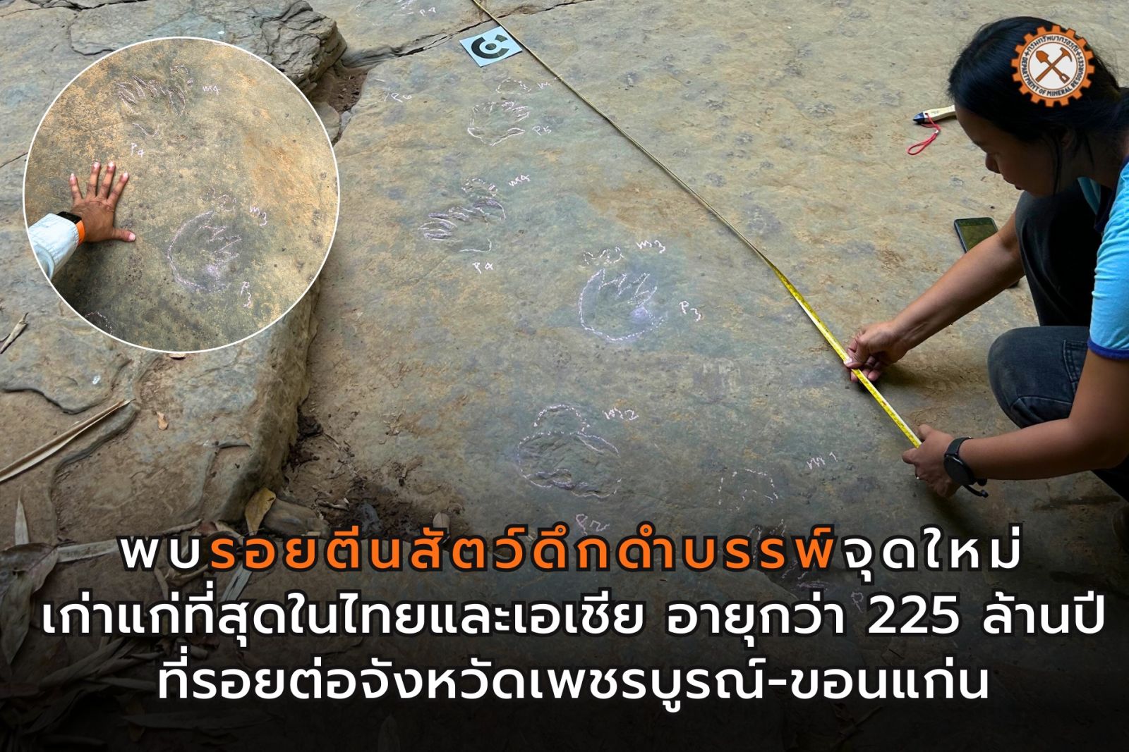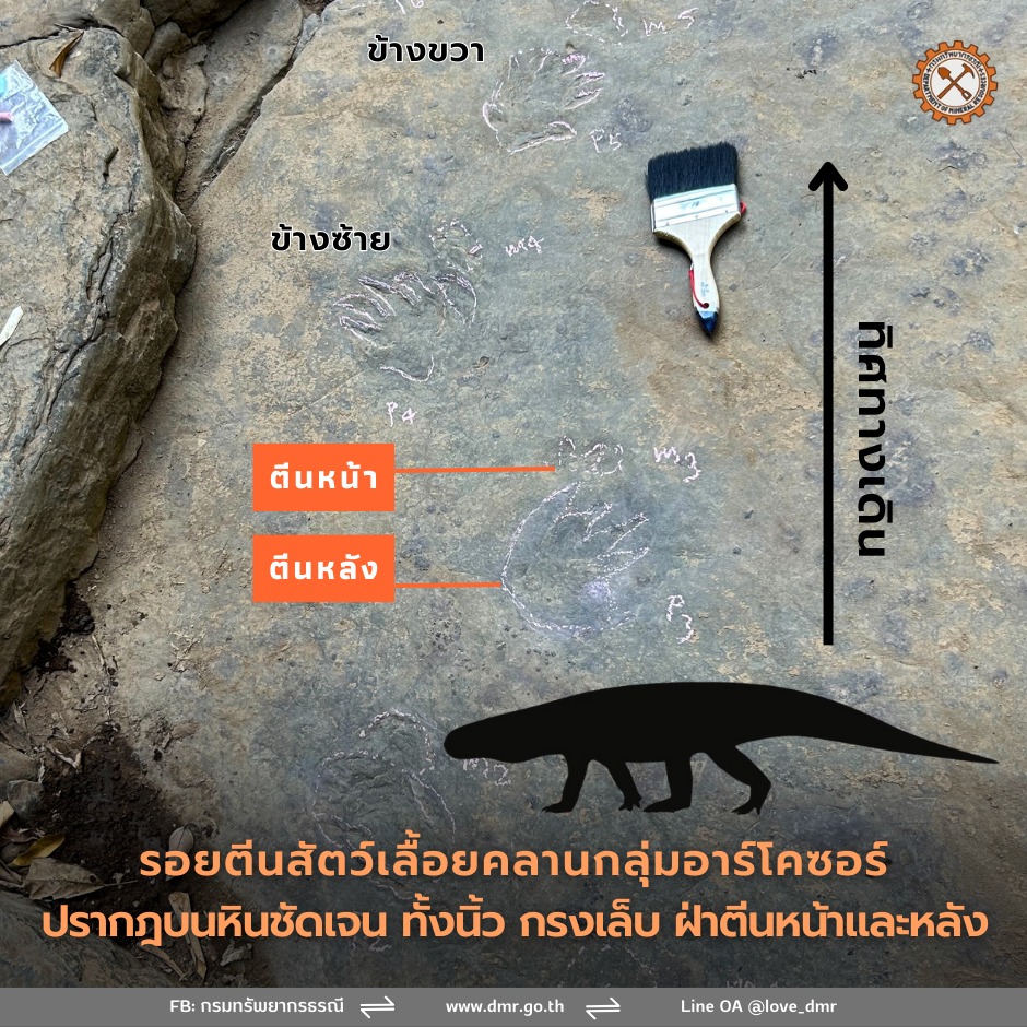 ตะลึง! ไทยค้นพบรอยเท้า "ไดโนเสาร์" อายุ 225 ล้านปี เก่าแก่ที่สุดในไทย-เอเชีย รายละเอียดบนหินชัด ทั้งนิ้ว กรงเล็บ ฝ่าตีนหน้า หลัง คาดเป็นรอยตีนสัตว์ชนิดใหม่ของไทย