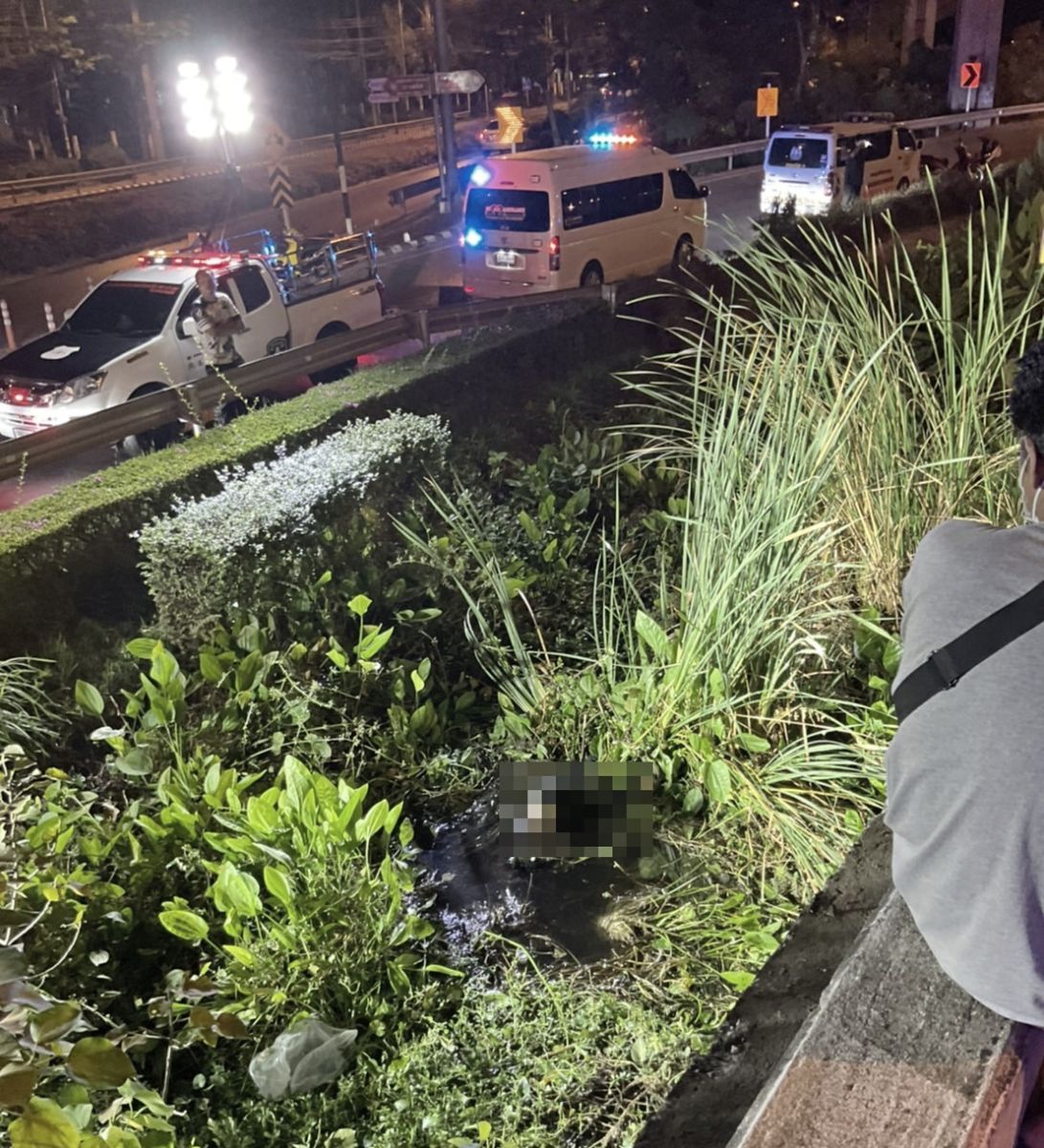 ที่เกิดเหตุ พบรถจักรยานยนต์ คาวาซากิ สีดำ ป้ายทะเบียน สระบุรี ล้มคว่ำกลางถนนบริเวณเชิงทางลงสะพานข้ามคลองบางกอกน้อยแต่ไม่พบผู้ขับขี่ อาสากู้ภัยตรวจสอบ บนสะพานก่อนถึงจุดที่รถล้ม พบแขนซ้ายมนุษย์ตกอยู่ 1 ท่อน จึงดำเนินการค้นหาบริเวณคูน้ำใต้สะพาน พบร่างของชาย 1 คน สภาพร่างนอนคว่ำหน้าจมอยู่ในน้ำ พบว่าเสียชีวิตแล้ว ตรวจสอบเอกสารเป็นผู้ชาย อายุประมาณ 25 ปี ขณะนี้อยู่ระหว่างรอแพทย์เวร ร่วมทำการชันสูตรพลิกศพ พื้นที่ สน.บางยี่ขัน