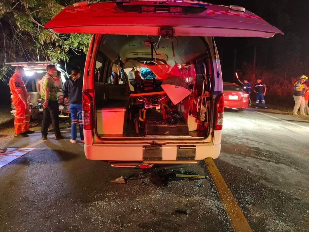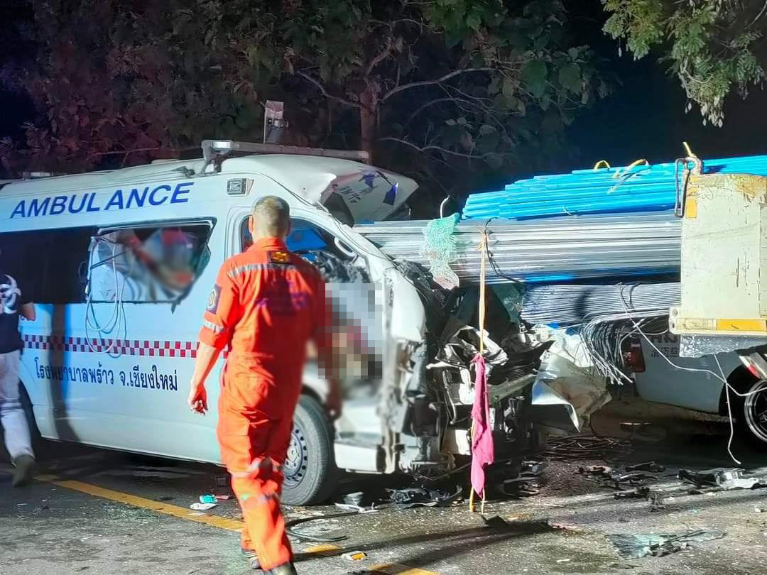 ที่เกิดเหตุ พบรถตู้ ลักษณะเป็นรถพยาบาลกู้ชีพ ของ รพ.พร้าว สีขาว ป้ายทะเบียน 6072 เชียงใหม่ ลักษณะชนเข้ากับม้วนสังกะสี. เหล็กเส้น, ท่อพีวีซี ที่อยู่ท้ายรถบรรทุก 6 ล้อ ความรุนแรงทำให้มีผู้เสียชีวิต 2 คน เจ้าหน้าที่ต้องใช้เครื่องมือตัดถ่าง เพื่อนำร่างออกจากตัวรถ แล้วตรวจสอบเอกสาร เป็นผู้ชาย 1 คน และผู้หญิง 1 คน