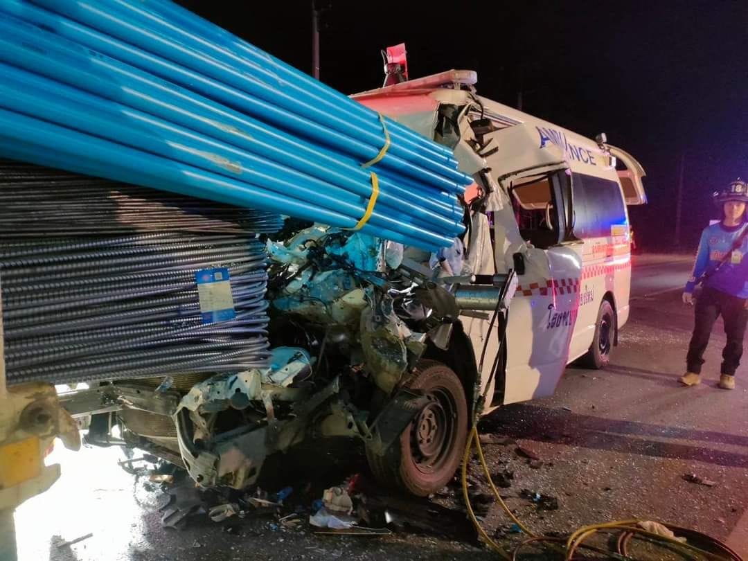 รถตู้พยาบาล เสยเข้าท้ายรถ 6 ล้อบรรทุกวัสดุก่อสร้าง ม้วนสังกะสี, เหล็กเส้นพุ่งทะลุกระจก คนขับ-คนนั่งข้างเสียชีวิต 2 รายริมถนนสายเชียงใหม่ - พร้าว