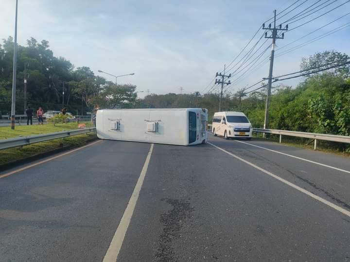 รถบัสนำเที่ยวพลิกตะแคง นทท.ชาวจีน บาดเจ็บหลายราย บริเวณโค้งบางดุก จังหวัดภูเก็ต
