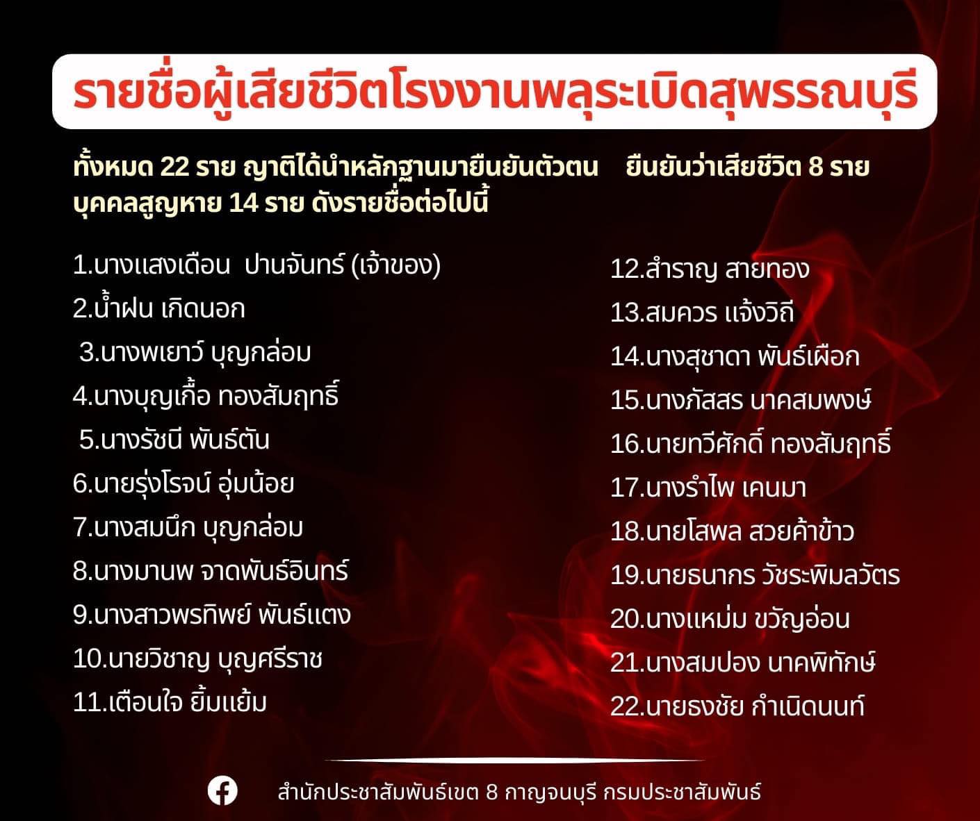 ทั้งนี้ ญาติได้นำหลักฐานมายืนยันการเสียชีวิตแล้ว 8 ราย ที่เหลืออีก 14 ราย เป็นบุคคลสูญหาย