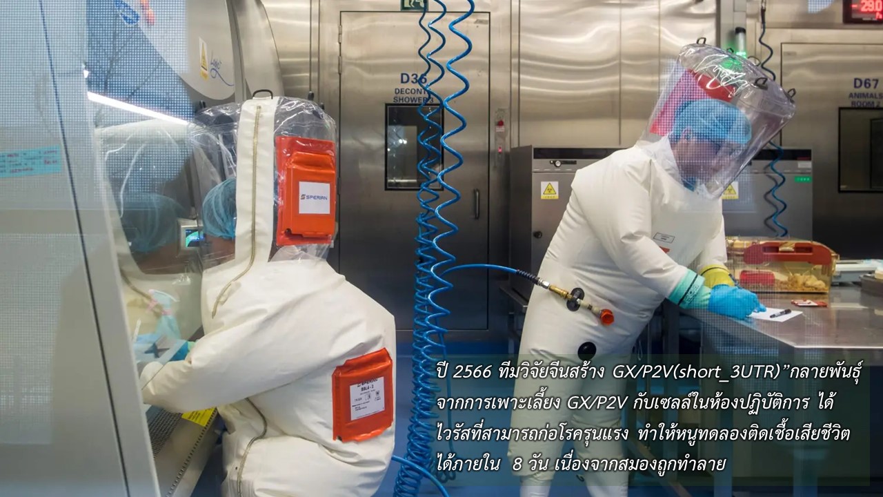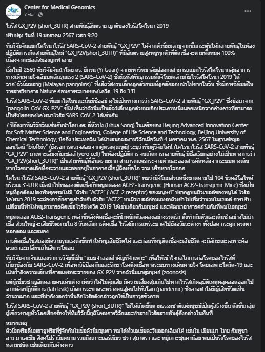 19 ม.ค.2567 เมื่อเวลา 09.20 น. Center for Medical Genomics ศูนย์จีโนมทางการแพทย์ รพ.รามาธิบดี รายงานว่า ทีมวิจัยจีนแยกโคโรนาไวรัส SARS-CoV-2 สายพันธุ์ “GX/P2V” ได้จากตัวนิ่มมลายูจากนั้นกระตุ้นให้กลายพันธุ์ในห้องปฏิบัติการเกิดสายพันธุ์ใหม่ “GX/P2V(short_3UTR)” ที่มีอันตรายสูง หนูทุกตัวที่ติดเชื้อจะตายทั้งหมด 100% เนื่องจากเซลล์สมองถูกทำลาย