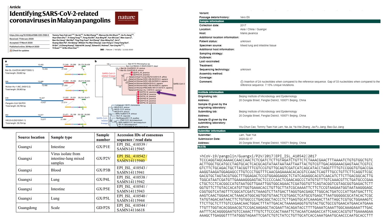 เริ่มในปี 2560 ทีมวิจัยจีนนำโดย ดร.ยี่กวน (Yi Guan) จากมหาวิทยาลัยฮ่องกงสามารถแยกไวรัสโคโรนากลุ่มอาการทางเดินหายใจเฉียบพลันรุนแรง 2 (SARS-CoV-2) ซึ่งมีรหัสพันธุกรรมทั้งจีโนมคล้ายกับไวรัสโคโรนา 2019 ได้จาก“ตัวนิ่มมลายู (Malayan pangolins)” ซึ่งสัตว์สงวนเลี้ยงลูกด้วยนมที่ถูกลักลอบนำไปขายในจีน ซึ่งมีการตีพิมพ์ในวารสารวิชาการ Nature ก่อนการระบาดของโควิด-19 ถึง 3 ปี