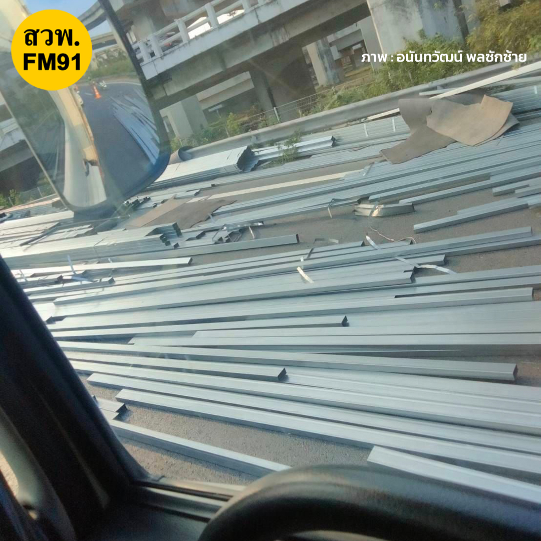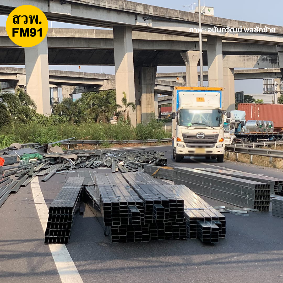 เวลา 16.21 น. ถ.เทพรัตน (บางนา-ตราด) ขาเข้า ก่อนเบี่ยงเข้าทางพิเศษกาญจนาภิเษก รถบรรทุกทำเหล็กกล่องจำนวนมาก ตกหล่น กีดขวางทุกช่องทาง ท้ายสะสมถึงกม. 14