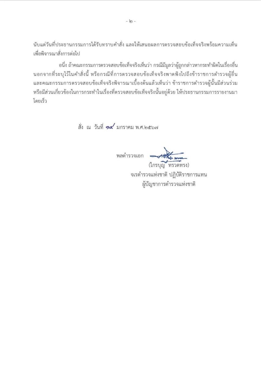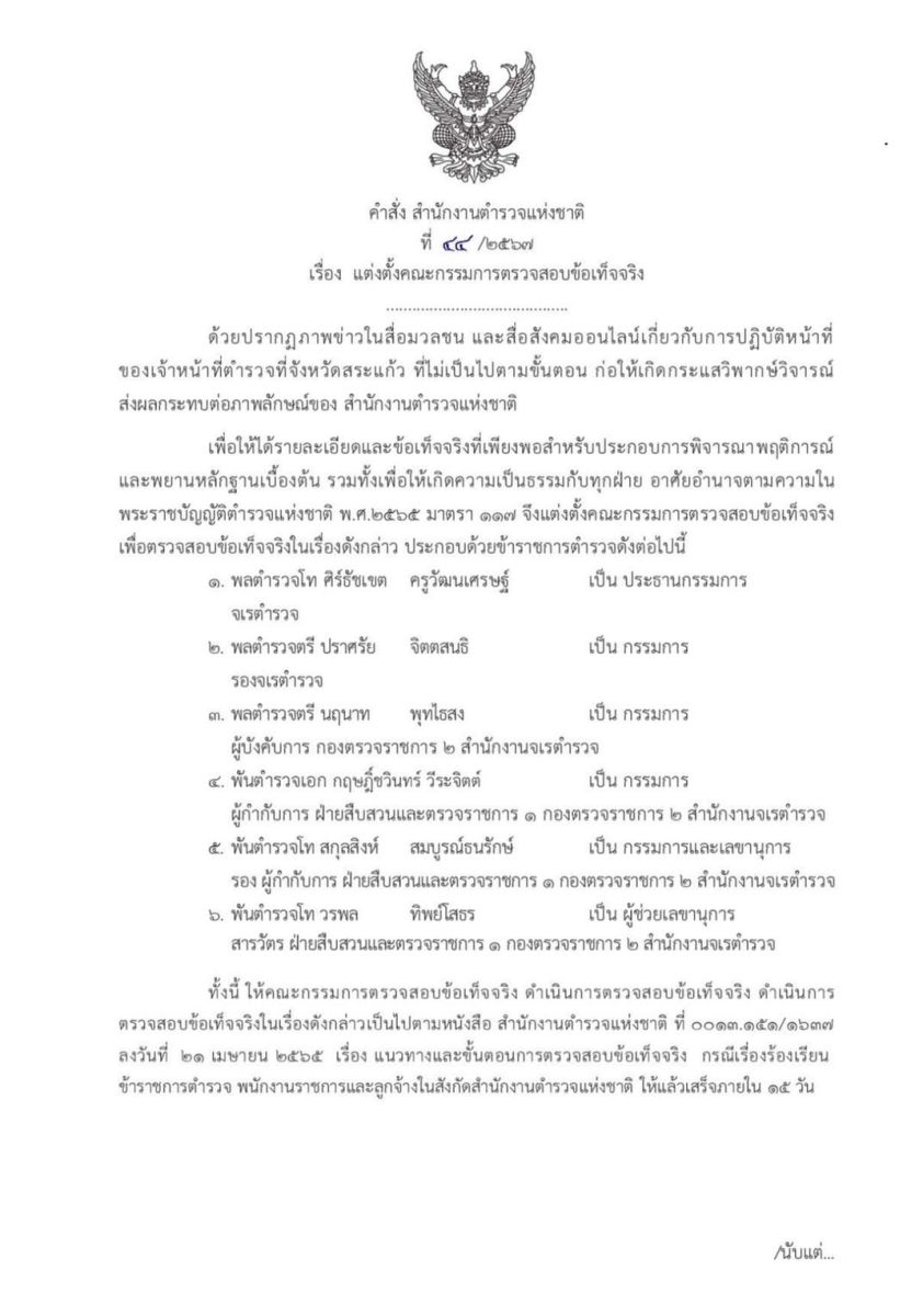 (21 ม.ค. 2567) ที่สำนักงานตำรวจแห่งชาติ พล.ต.อ.ไกรบุญ ทรวดทรง จเรตำรวจแห่งชาติ ปฏิบัติราชการแทน ผู้บัญชาการตำรวจแห่งชาติ มีหนังสือคำสั่ง ตร.ที่ 44/2567 ลงวันที่ 19 ม.ค.2567 เรื่อง แต่งตั้งคณะกรรมการตรวจสอบข้อเท็จจริง ใจความว่า ด้วยปรากฏภาพข่าวในสื่อมวลชน และสื่อสังคมออนไลน์เกี่ยวกับการปฏิบัติหน้าที่ของเจ้าหน้าที่ตำรวจที่จังหวัดสระแก้ว ที่ไม่เป็นไปตามขั้นตอน ก่อให้เกิดกระแสวิพากษ์วิจารณ์ ส่งผลกระทบต่อภาพลักษณ์ของสำนักงานตำรวจแห่งชาติ