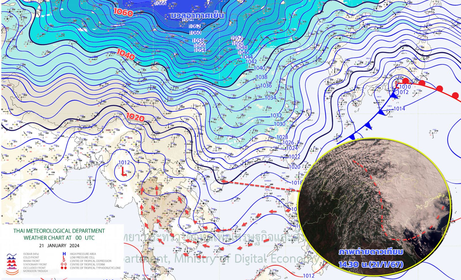 กรมอุตุนิยมวิทยา โพสต์ผ่านเฟซบุ๊ก ข้อความระบุ แผนที่อากาศผิวพื้น เวลา 07.00 น. เช้าวันนี้ (21/1/67) : พอที่จะเริ่มมองเห็นมวลอากาศเย็น จากแถบไซบีเรีย เริ่มแผ่ลงมา เส้นความกดอากาศเท่า (Isobar) 1020 hPa เริ่มปกคลุมประเทศจีน และคาดว่าจะแผ่ลงมาปกคลุมภาคอีสานของไทย ช่วงกลางคืนพรุ่งนี้( 22 ม.ค.67) และจะปกคลุมถึงวันที่ 26 ม.ค.67 แต่เนื่องจากมวลอากาศเย็นระลอกนี้เคลื่อนตัวไปทางทะเลจีนใต้ตอนบน จึงทำให้มีลมใต้ ตะวันออกเฉียงใต้พัดปกคลุมภาคภาคกลางตอนล่าง ภาคตะวันออก กทม.ปริมณฑล และภาคใต้ตอนบน (เพชรบุรี ประจวบฯ) อาจจะเกิดฝน/ฝนฟ้าคะนองบางแห่งได้ช่วงแรก (22-23) ส่วนภาคใต้มีฝน/ฝนฟ้าคะนอง เพิ่มขึ้นบ้าง คลื่นลมแรงขึ้น ต้องติดตามและเฝ้าระวังความแปรปรวนของสภาพอากาศในช่วงสัปดาห์หน้านี้ (22 - 26 )