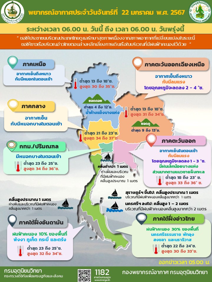 ลักษณะอากาศทั่วไป วันที่ 22 มกราคม 2567 พยากรณ์อากาศ 24 ชั่วโมงข้างหน้า บริเวณความกดอากาศสูงกำลังค่อนข้างแรงระลอกใหม่ได้แผ่ปกคลุมถึงบริเวณประเทศจีนตอนใต้และเวียดนามตอนบนแล้ว คาดว่าจะแผ่คลุมภาคตะวันออกเฉียงเหนือและภาคตะวันออกในวันนี้ (วันที่ 22 ม.ค. 67) โดยจะทำให้ภาคตะวันออกเฉียงเหนือมีอากาศเย็นถึงหนาวในตอนเช้ากับมีลมแรง และอุณหภูมิจะลดลง 2-4 องศาเซลเซียส
