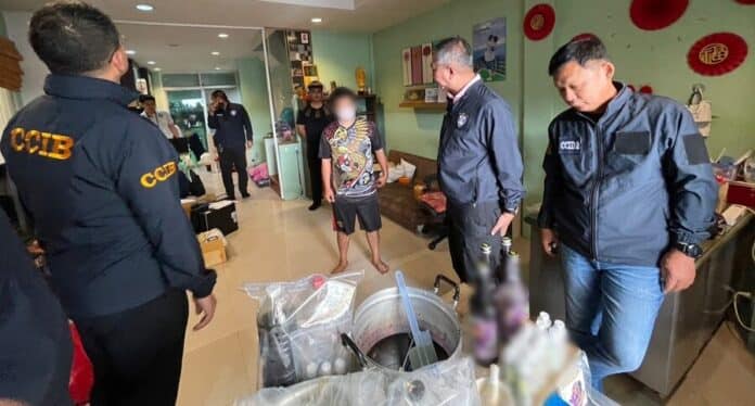 พล.ต.ท.วรวัฒน์ วัฒน์นครบัญชา ผบช.สอท. พร้อมด้วยนางอรัญญา เทพพิทักษ์ ผู้อำนวยการศูนย์จัดการเรื่องร้องเรียนและปราบปรามการกระทำผิดกฎหมายเกี่ยวกับผลิตภัณฑ์สุขภาพ (ผอ.ศรป.) สำนักงานคณะกรรมการอาหารและยา (อย.) กระทรวงสาธารณสุขและเจ้าหน้าที่ นำหมายค้นศาลอาญาตลิ่งชัน ที่ ค.15/2567 เข้าตรวจค้นบ้านหลังหนึ่ง ในหมู่บ้านย่านถนนเลียบคลองภาษีเจริญฝังเหนือ เขตหนองแขม กทม. และจับกุม นาย รอ (นามสมมุติ) อายุ 33 ปี พร้อมของกลาง ประกอบด้วย ผลิตภัณฑ์ยี่ห้อ “LEAN KINGDOM 69” วัตถุออกฤทธิ์ CLONARIL 148 เม็ด วัตถุออกฤทธิ์ CONVULSIL จำนวน 150 เม็ด, ยาฟาเทคไซรัป 29 ขวด ยามาโคลา 218 เม็ด, น้ำหวานกลิ่นบลูเบอรี่ จำนวน 4 ขวด ขวดบรรจุภัณฑ์ติดฉลาดยี่ห้อ “LEAN KINGDOM 69” และอุปกรณ์ที่ใช้ผลิตอีกหลายรายการ และแจ้งข้อหา “มีไว้ในครองครองวัตถุออกฤทธิ์ในประเภท 4 โดยไม่ได้รับอนุญาต” ตาม พ.ร.บ.ให้ใช้ประมวลกฎหมายยาเสพติดฯ ม.35 (5), ม.94, ม.149 วรรคสาม และ “ขายยาแผนปัจจุบัน โดยไม่ได้รับอนุญาต” ตาม พ.ร.บ.ยา พ.ศ.2510 มาตรา 12 ประกอบมาตรา 101″
