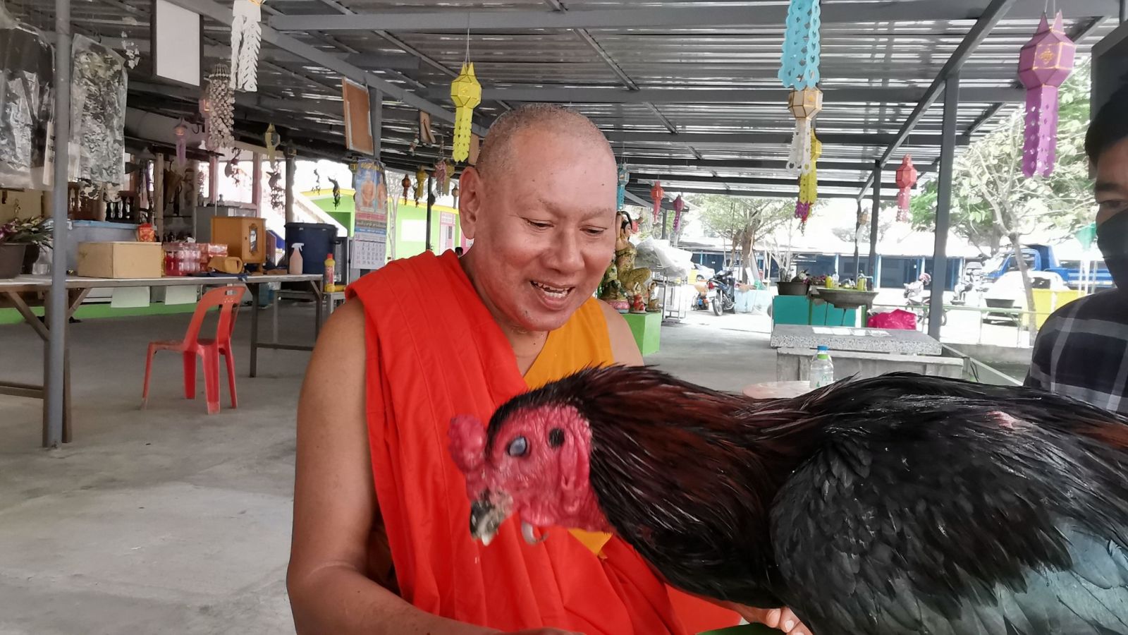 ไก่ชนลิ้นโผล่ที่กลางคอ เจ้าอาวาสเผย 'ที่มาน่าสงสาร' ก่อนกลายเป็นขวัญใจประจำวัด จ.นนทบุรี