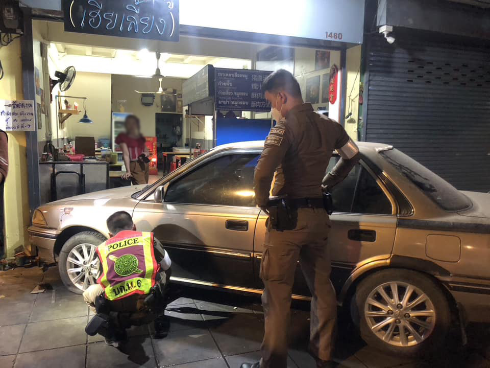 รถเก๋งพุ่งชนเข้าร้าน พนักงานโดดหนีรอดหวุดหวิด คนขับเผย 'จะแวะซื้อเกาเหลา' ตร.คุมตัวเป่าวัดแอลกอฮอล์ พบสูง 292 มิลลิกรัมเปอร์เซนต์