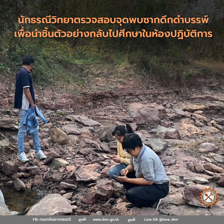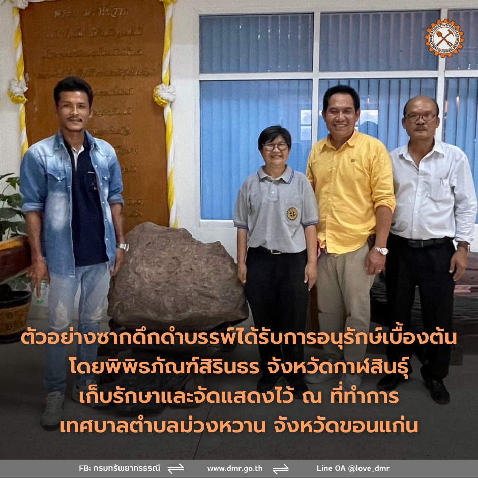 เจ้าหน้าที่ พิพิธภัณฑ์สิรินธร-Dinosaur museum สำนักงานทรัพยากรธรณี เขต 2 กรมทรัพยากรธรณี ได้รับแจ้งข้อมูลการพบสิ่งอันมีเหตุควรเชื่อได้ว่าเป็นซากดึกดำบรรพ์จาก นายเชาวลิต บุญชาย ประชาชนในพื้นที่ จึงได้ลงพื้นที่ทำการสำรวจตรวจสอบ ณ บริเวณฝายน้ำล้น บ้านโนนพยอม ตำบลม่วงหวาน อำเภอน้ำพอง จังหวัดขอนแก่น นำโดย นักวิชาการทรัพยากรธรณีชำนาญการพิเศษ นางสาวศศอร ขันสุภา เมื่อวันที่ 31 มกราคม 2567 ที่ผ่านมา