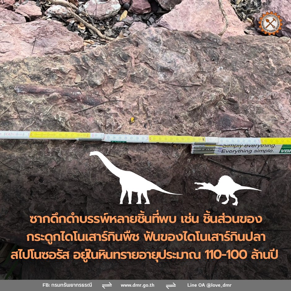 ภายหลังการตรวจสอบในพื้นที่ พบซากดึกดำบรรพ์ชิ้นส่วนของกระดูกสันหลังของไดโนเสาร์กินพืชซอโรพอด(sauropod) และเศษกระดูกซี่โครงไม่สามารถระบุชนิด ฟันของไดโนเสาร์กินปลาสไปโนซอรัส (spinosaurus) พร้อมรอยชอนไช (burrow) ที่อยู่ในชั้นหินทรายเนื้อละเอียดสีน้ำตาลแดงของหมวดหินโคกกรวด (Khok Kruat Formation) กลุ่มหินโคราช อายุประมาณ 110-100 ล้านปีก่อน ทั้งนี้ได้ให้นายเชาวลิต บุญชาย ผู้ค้นพบ แจ้งพบซากดึกดำบรรพ์ ต่อนายกเทศมนตรีเทศบาลตำบลม่วงหวาน เจ้าพนักงานท้องถิ่น โดยตำแหน่ง เพื่อดำเนินการตามระเบียบตามพระราชบัญญัติคุ้มครองซากดึกดำบรรพ์ พ.ศ.2551