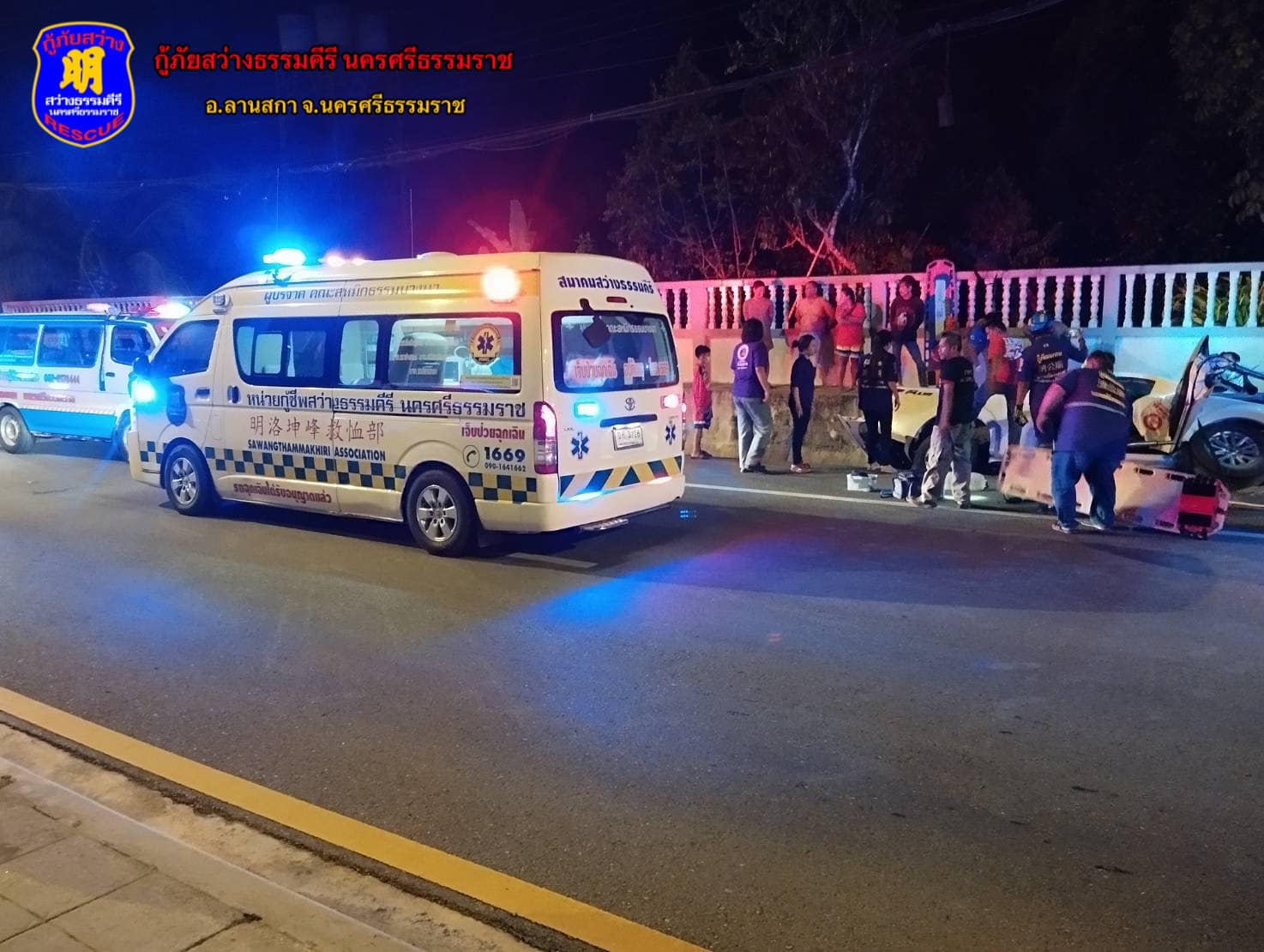 เมื่อวันที่ 2 กุมภาพันธ์ 2567 เวลา 22.05 น. กู้ภัยสว่างธรรมคีรี รับแจ้งว่า มีอุบัติเหตุรถยนต์กระบะเสียหลักลงข้างทาง มีผู้บาดเจ็บหลายราย ริมถนนเส้นทางลานสกา - จันดี เลยทางเข้า รร.บ้านสันยูง ประมาณ 200 เมตร ในพื้นที่ บ้านสันยูง ต.ท่าดี อ.ลานสกา จ.นครศรีธรรมราช