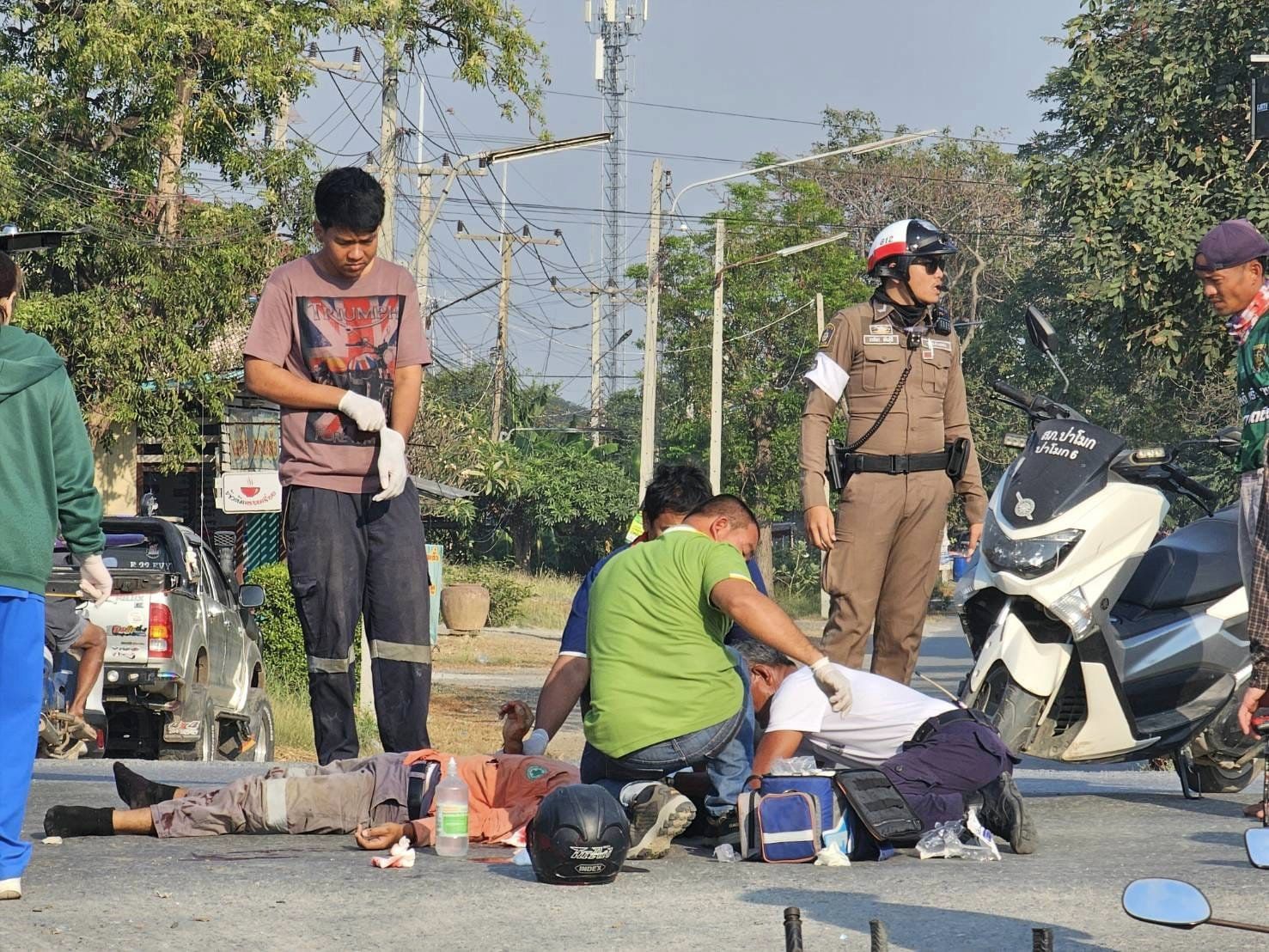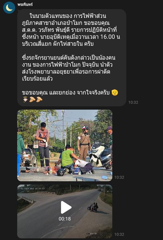 เมื่อช่วงเย็นวันที่ 31 ม.ค. 67 เวลา 16.10 น. ที่ผ่านมา เกิดอุบัติเหตุรถจักรยานยนต์ชนกับรถบรรทุกพ่วง โดยมีกล้องวงจรปิดบันทึกเหตุการณ์ไว้ได้ บริเวณแยกผักไห่ อ.ป่าโมก จ.อ่างทอง เป็นชายคนหนึ่งขับรถจักรยานยนต์พุ่งชนรถบรรทุกพ่วงล้อที่กำลังเลี้ยวข้ามเลนอย่างรุนแรง จนทำให้คนขับได้บาดเจ็บ ซึ่งขณะนั้นมี ส.ต.ต.วรภัทร พันธุ์ดี ผบ.หมู่ จราจร สภ.ป่าโมก กำลังกลับจากการปฏิบัติหน้าที่จอดรอข้ามสี่แยกอยู่พอดี ทำให้ ส.ต.ต.วรภัทร ทิ้งรถจักรยานยนต์ที่ขับขี่อยู่วิ่งเข้าไปช่วยเหลือชายคนดังกล่าว เพราะเกรงว่าจะถูกล้อรถ 18 ล้อด้านหลังทับ ก่อนที่จะประสานเจ้าหน้าที่กู้ภัยและเจ้าหน้าที่กู้ชีพโรงพยาบาลป่าโมกเข้าช่วยเหลือนำส่งโรงพยาบาล